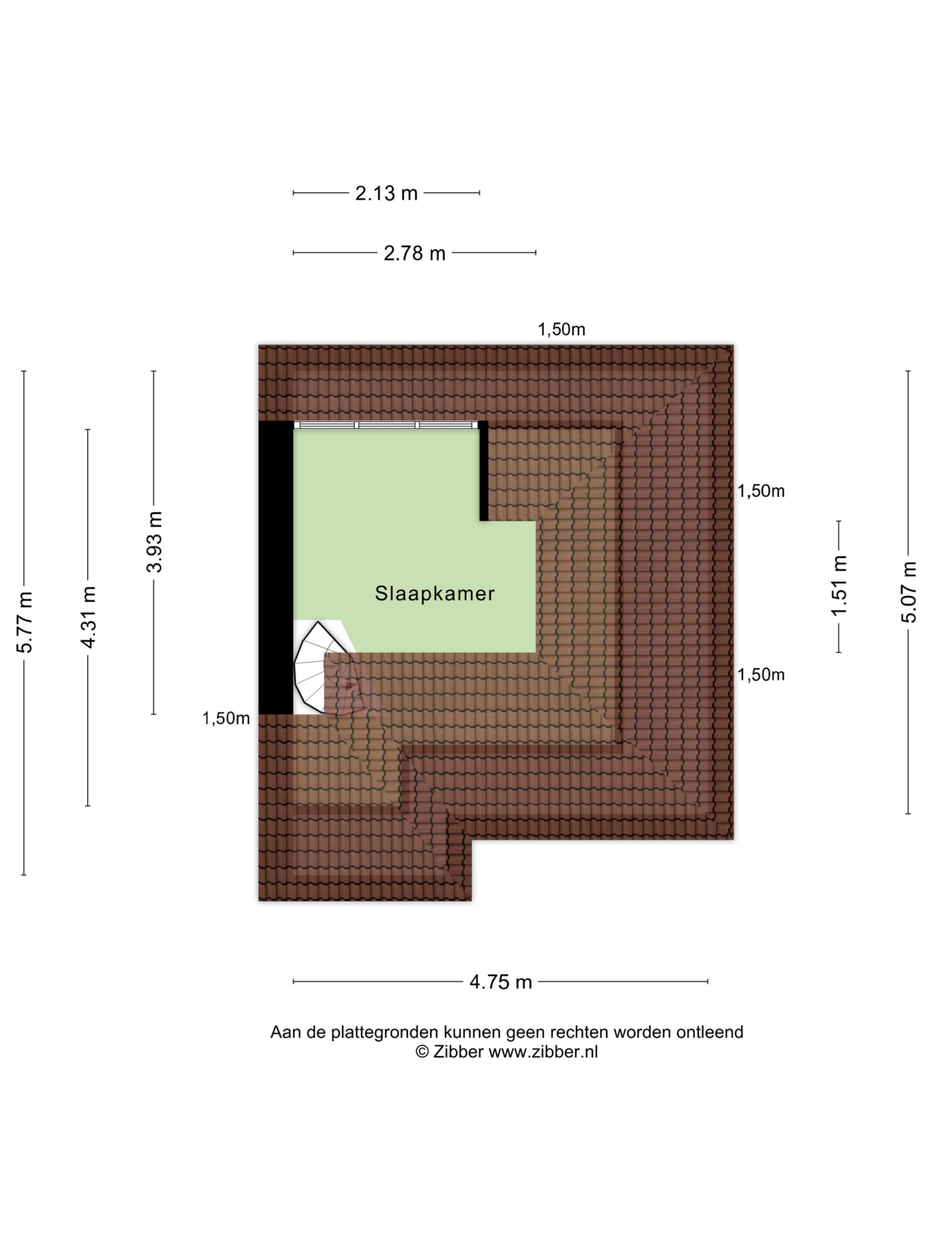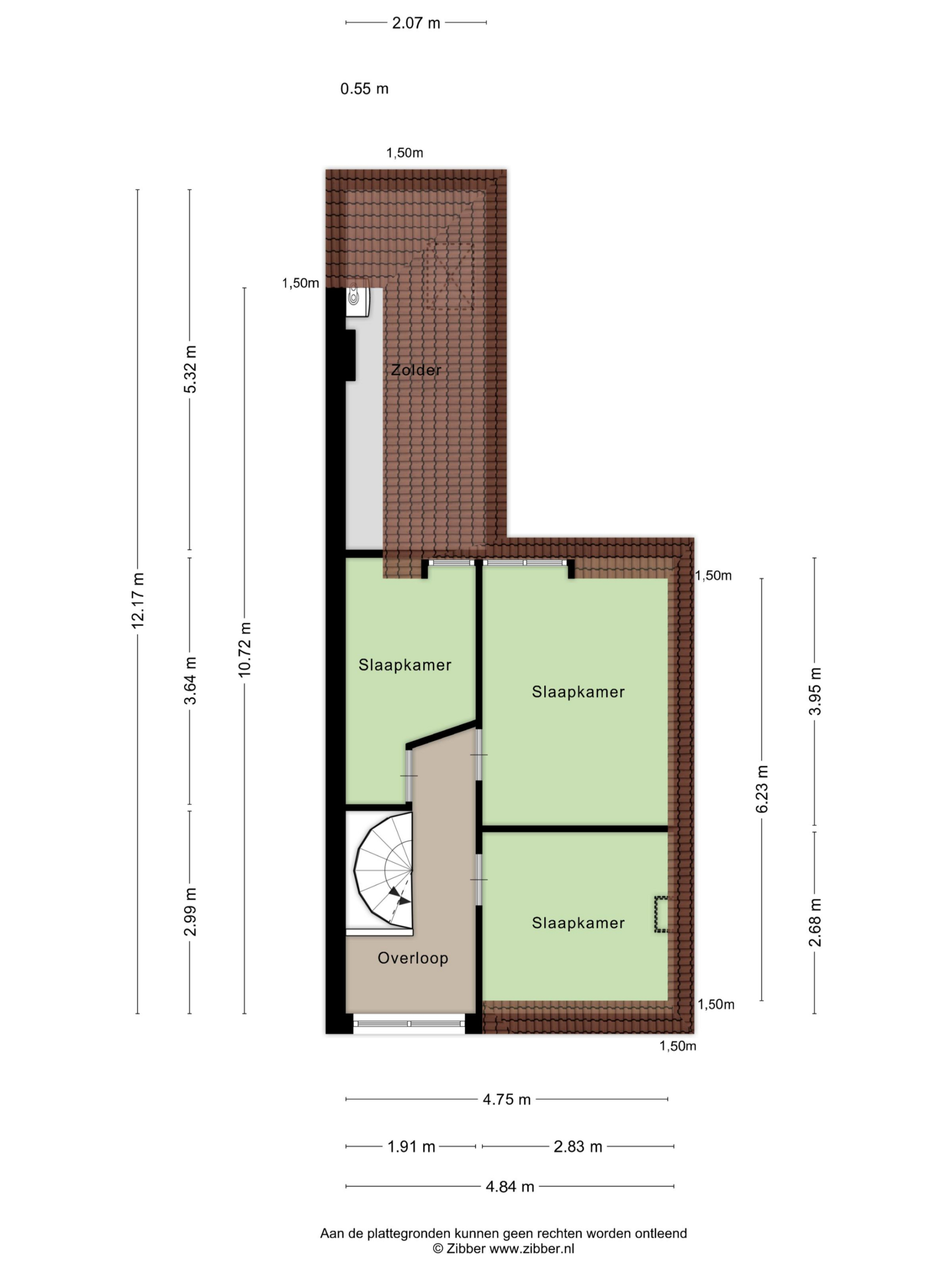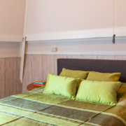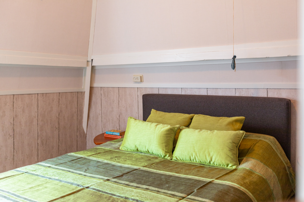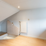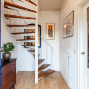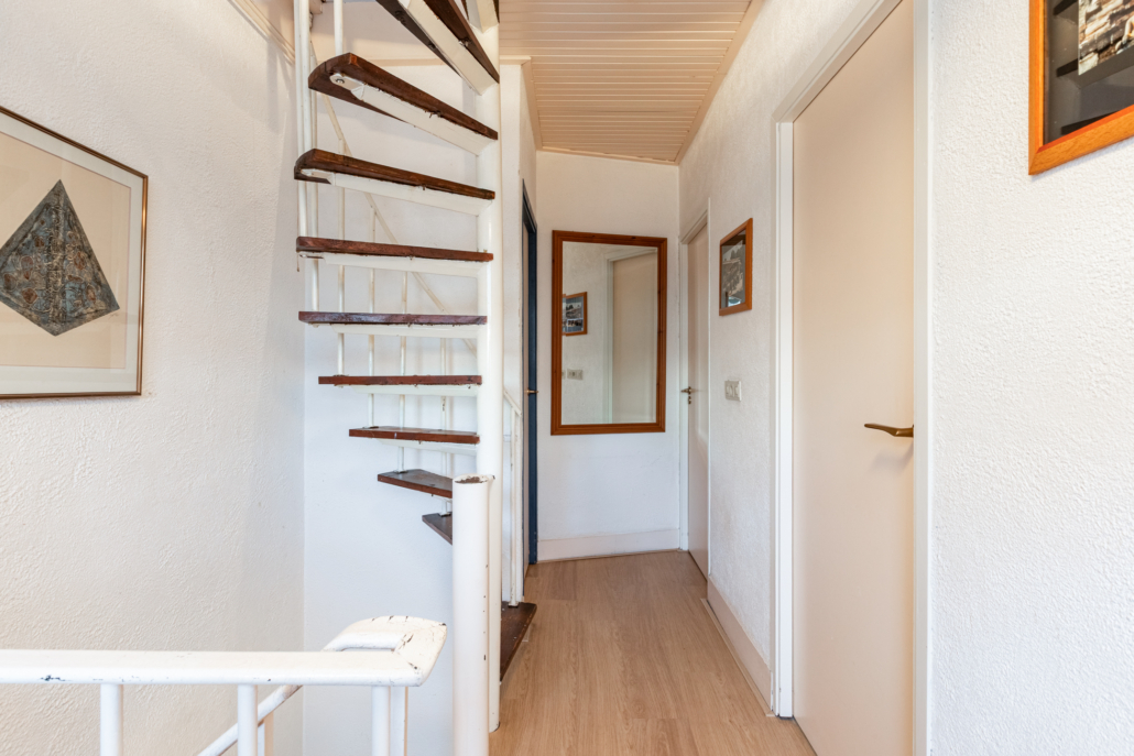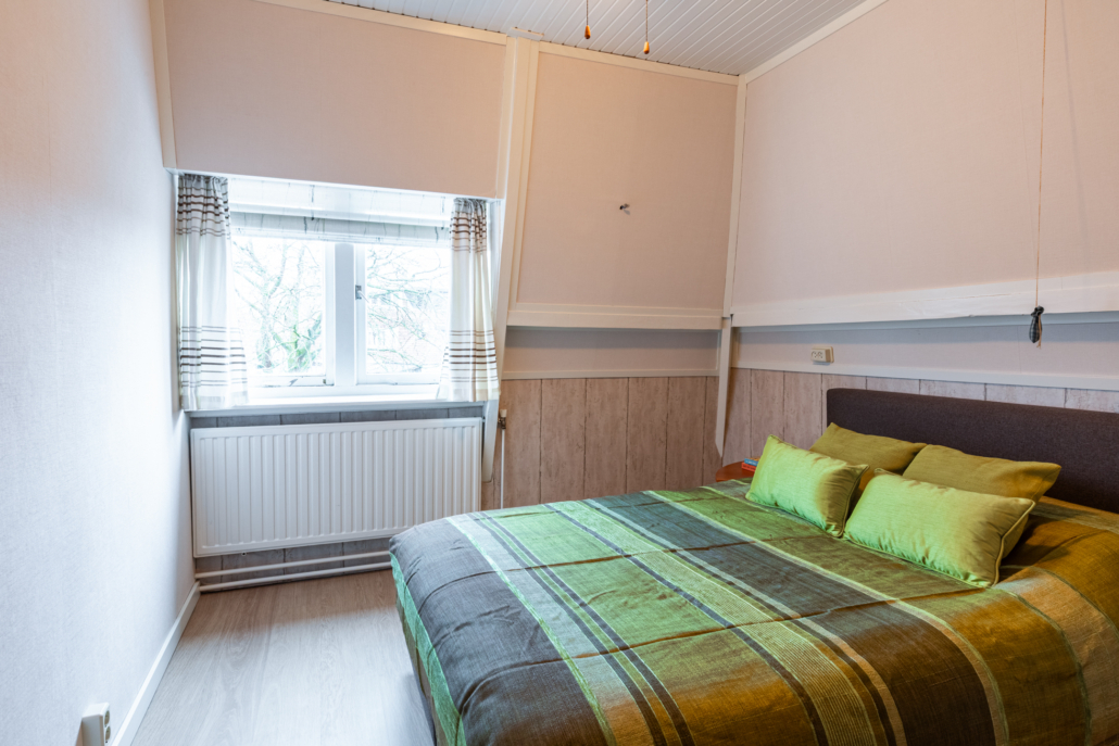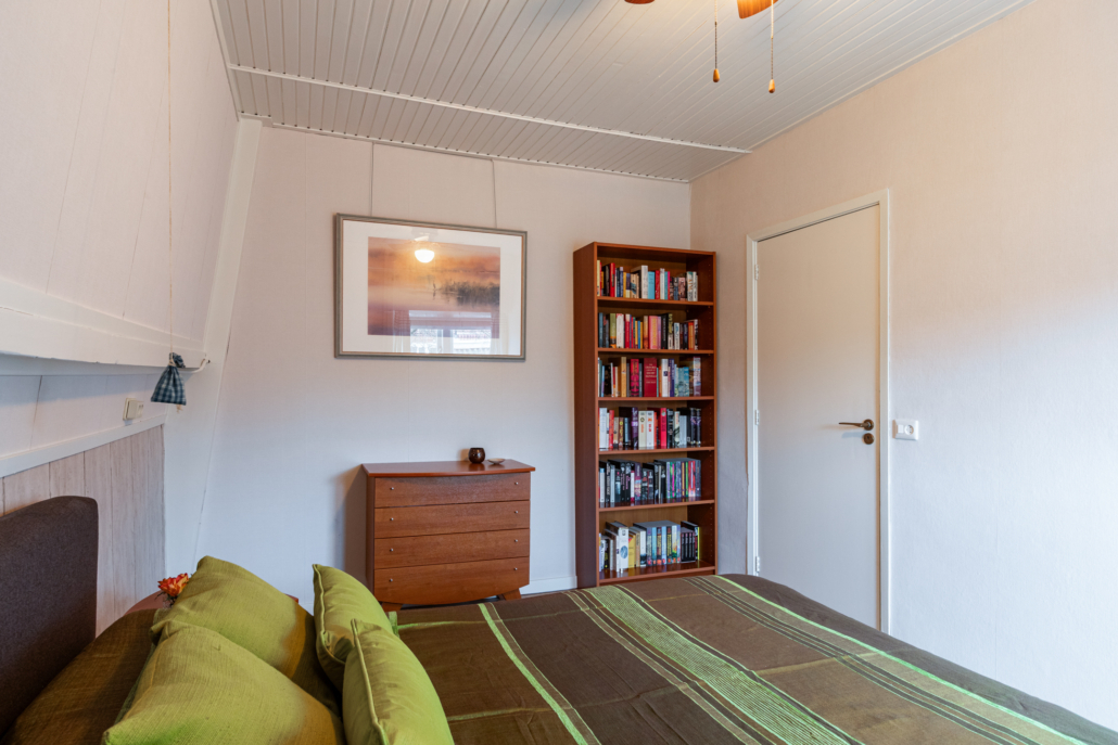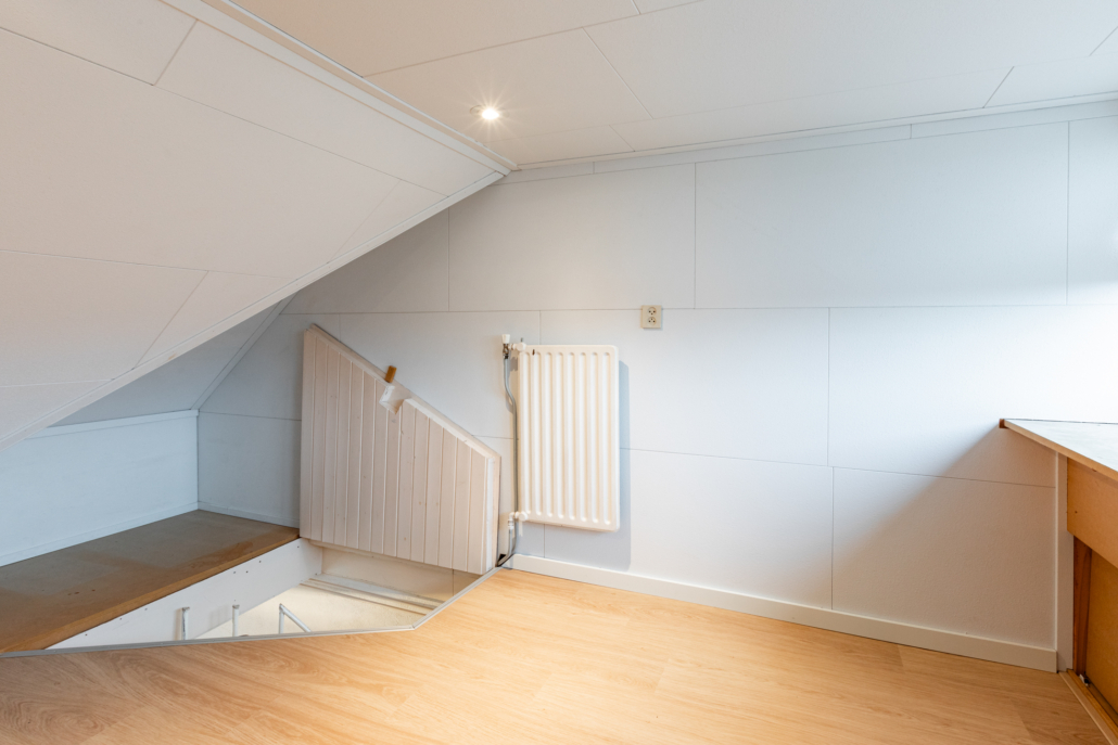 Een wat smallere vaste trap loopt naar de bovenste, tweede verdieping waar een zolder-/slaapkamer ligt met dakkapel aan de achterzijde en veel bergruimte onder de dakschuinte.
