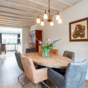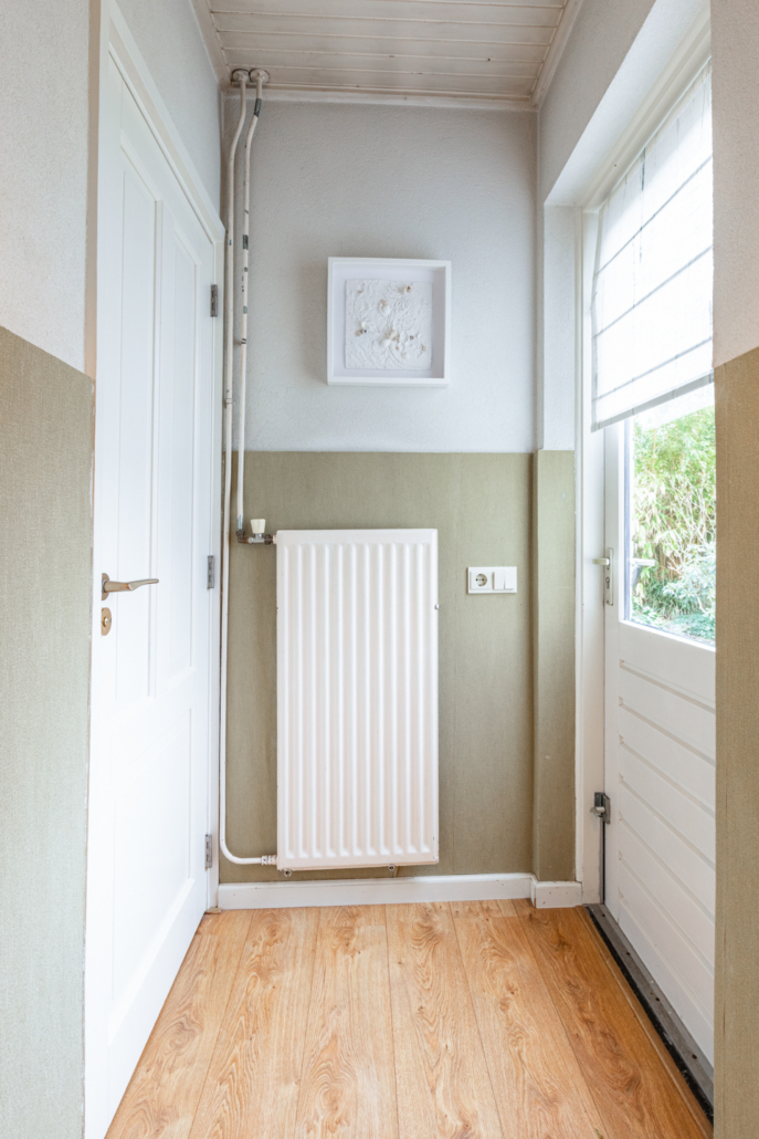 Een deur brengt ons naar een portaal aan de achterzijde met hier toegang tot de badkamer, separaat toilet, wasruimte en de achterdeur naar de tuin.