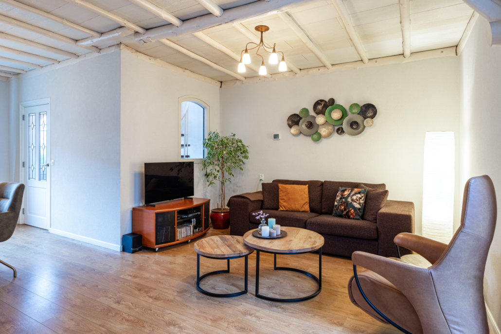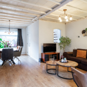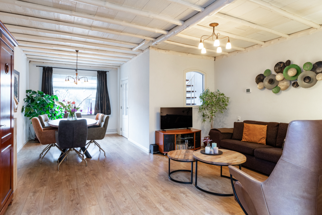 Een sfeervolle deur met ‘jaren 30 glas’ brengt ons naar de woonkamer. Prettige living met diverse indelingsmogelijkheden. In de uitbouw aan de achterzijde is de keuken gesitueerd waardoor de rest van de ruimte geheel als woon-/eetkamer kan worden gebruikt. Veel leefruimte dus! Op de vloer ligt laminaat en de muren zijn netjes afgewerkt. De voorzijde heeft een groot raam met uitzicht op de brede straat.