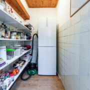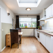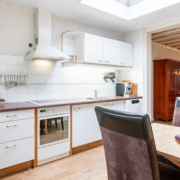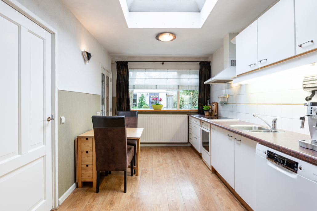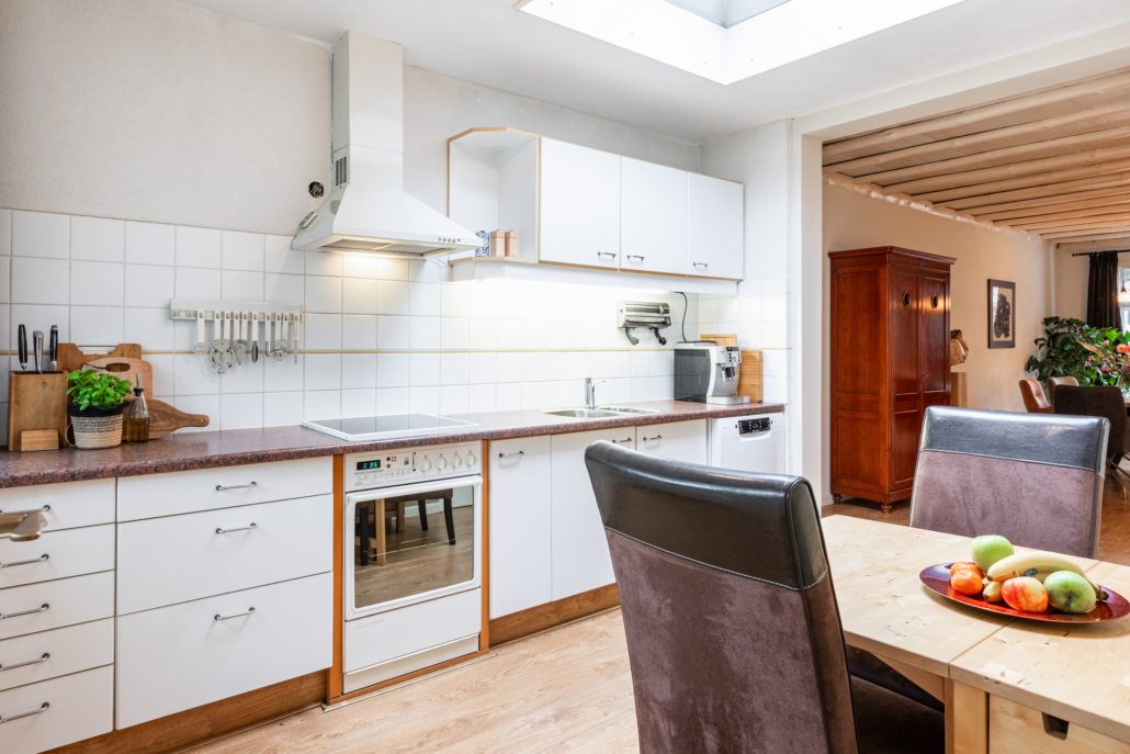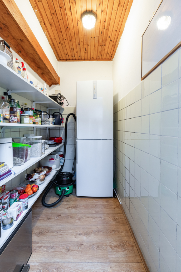 De keuken aan de achterzijde heeft een breed raam met uitzicht op de groene en zonnige achtertuin. Een extra grote lichtkoepel zorgt verder voor ruim voldoende daglicht, ook op de wat donkere winterse dagen. De keuken zelf is eenvoudig afgewerkt maar zeker bruikbaar en sfeervol met keramische kookplaat, oven, vele laden en kastjes. Er is een grote voorraadruimte met plek voor een koel-/vriescombinatie.