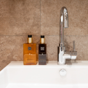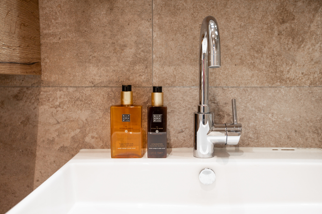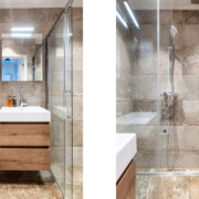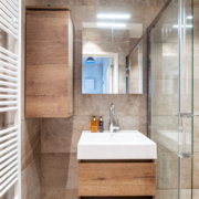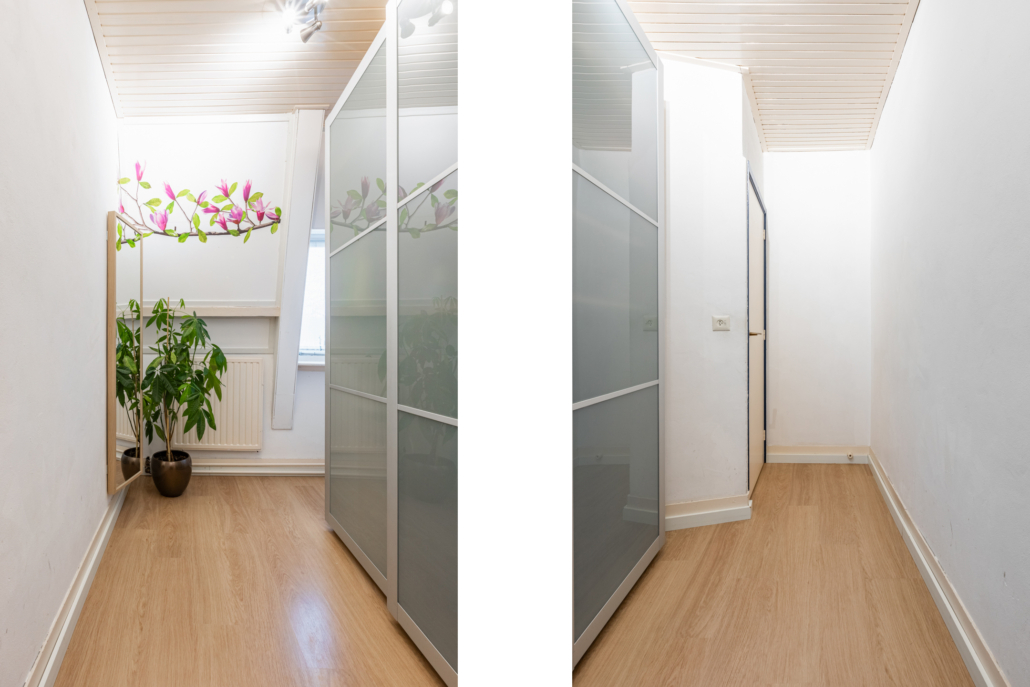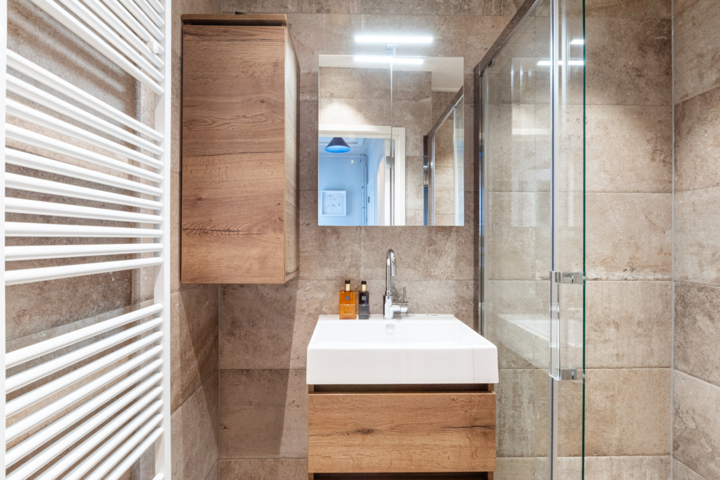 Hedendaagse vernieuwde badkamer met grote doucheruimte, wastafelmeubel en designradiator. In het tussenportaal is er toegang tot een bergzoldertje met hier de opstelling C.V.-ketel (Vaillant uit 2022).