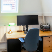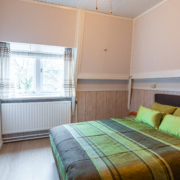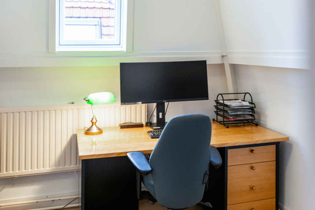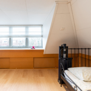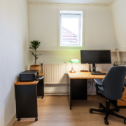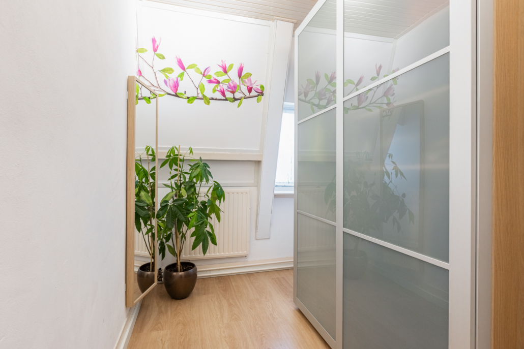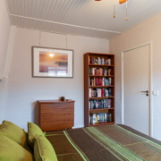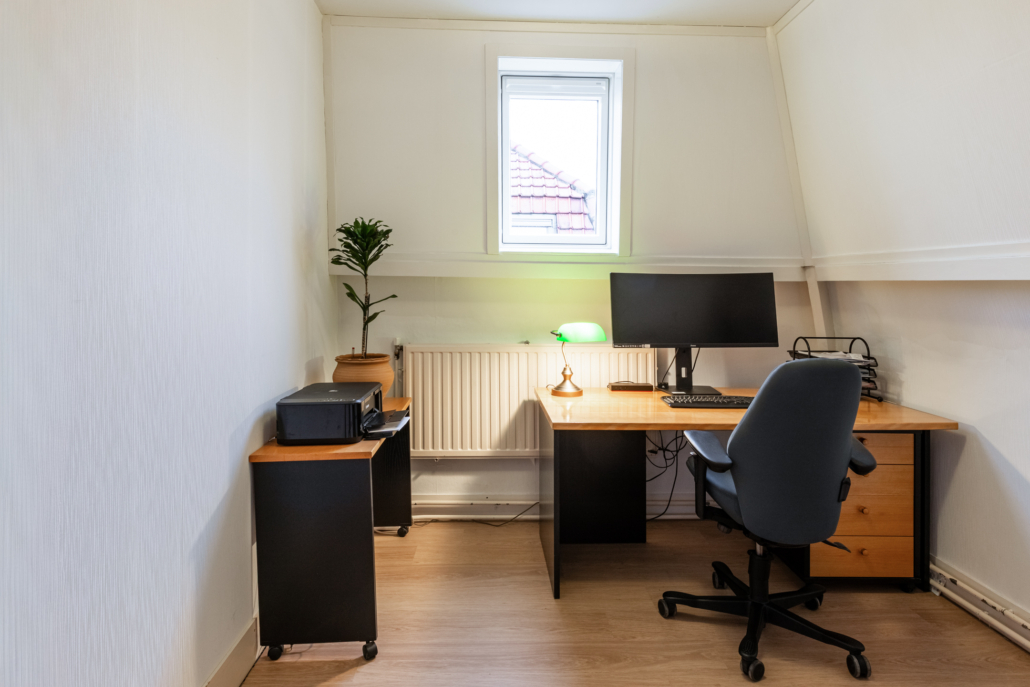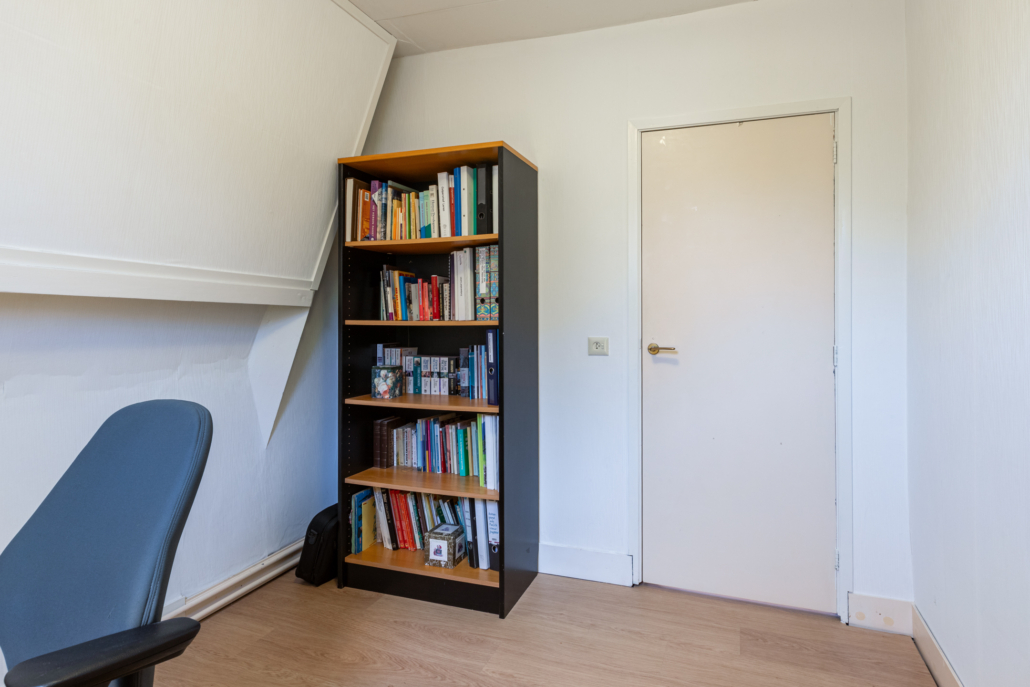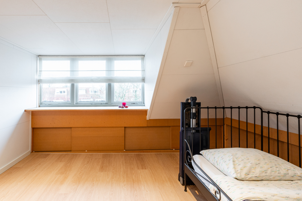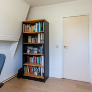 Op de eerste verdieping vinden we drie slaapkamers waarvan twee aan de achterzijde en de derde aan de voor-zijkant van de woning welke voorzien is van een Velux dakraam. De grootste slaapkamer ligt aan de achterzijde en heeft fijn zicht op de achtertuin.