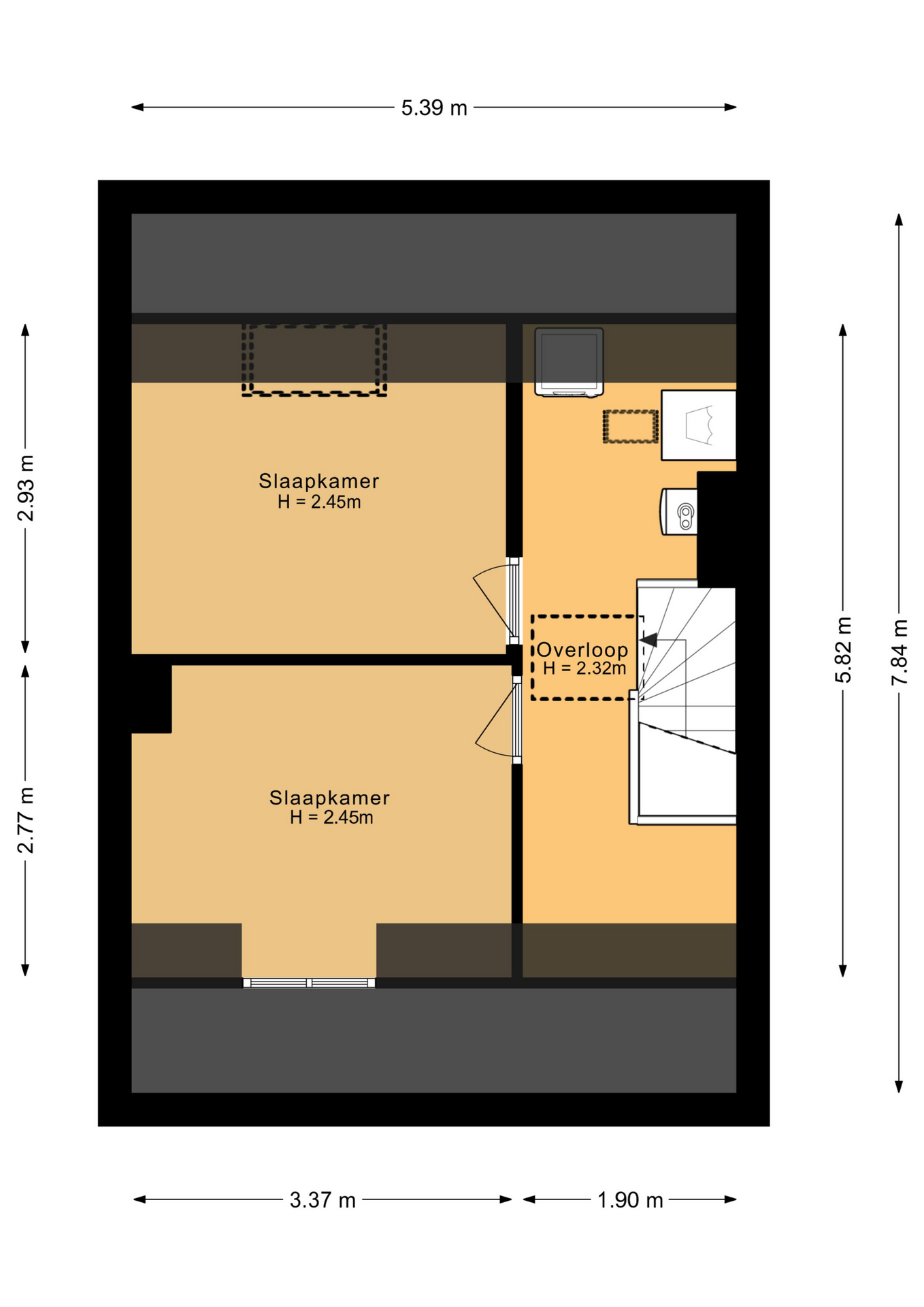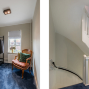 De tweede verdieping is bereikbaar middels een vaste trap. Een volwaardige verdieping met twee slaapkamers en een voorzolder.