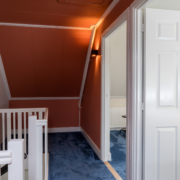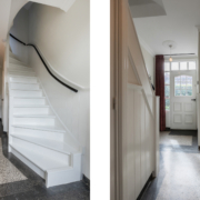 Via de vernieuwde trapopgang, waar de authentieke lambrisering behouden is gebleven, bereiken we de overloop met toegang tot drie slaapkamers en de badkamer.