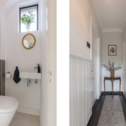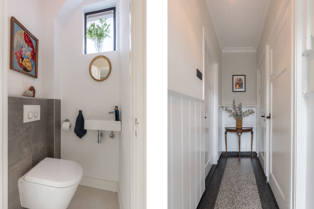 Via de fraai aangelegde voortuin komen we in de mooie ruime hal met originele terrazzo vloer. De hal geeft toegang tot de woonkamer, moderne toiletruimte, kelder met moderne en uitgebreide meterkast + omvormer en vloerverwarmingsunit.