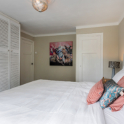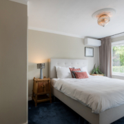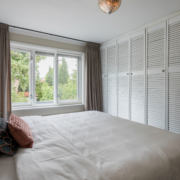 Aan de achterzijde bevindt zich de ruime hoofdslaapkamer met breed raam en zicht op de achtertuin. Deze kamer is voorzien van een praktische inbouwkast en airconditioning. Aan de voorzijde liggen nog twee slaapkamers, beide met onderhoudsvriendelijke kunststof kozijnen.