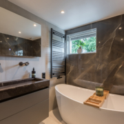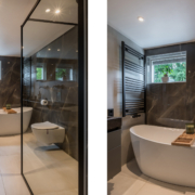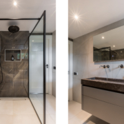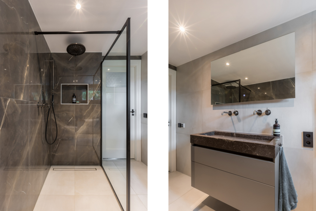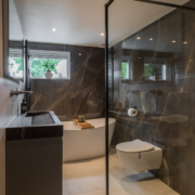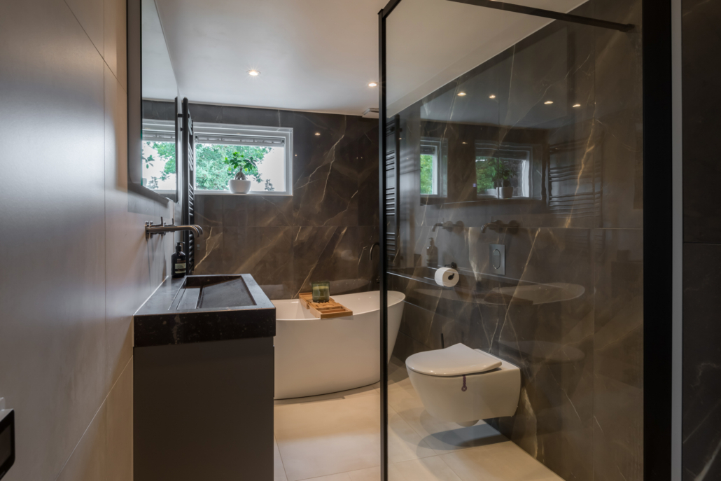 De badkamer is een echte blikvanger. In 2022 volledig vernieuwd en hoogwaardig afgewerkt in een moderne, luxe stijl. Hier vind je een vrijstaand ligbad, een ruime inloopdouche met stort- en handdouche (Hotbath), een op maat gemaakt wastafelmeubel van composiet (Paul Dekkers), een toilet en comfortabele elektrische vloerverwarming. Deze ruimte geeft je elke dag een wellnessgevoel!