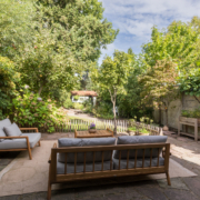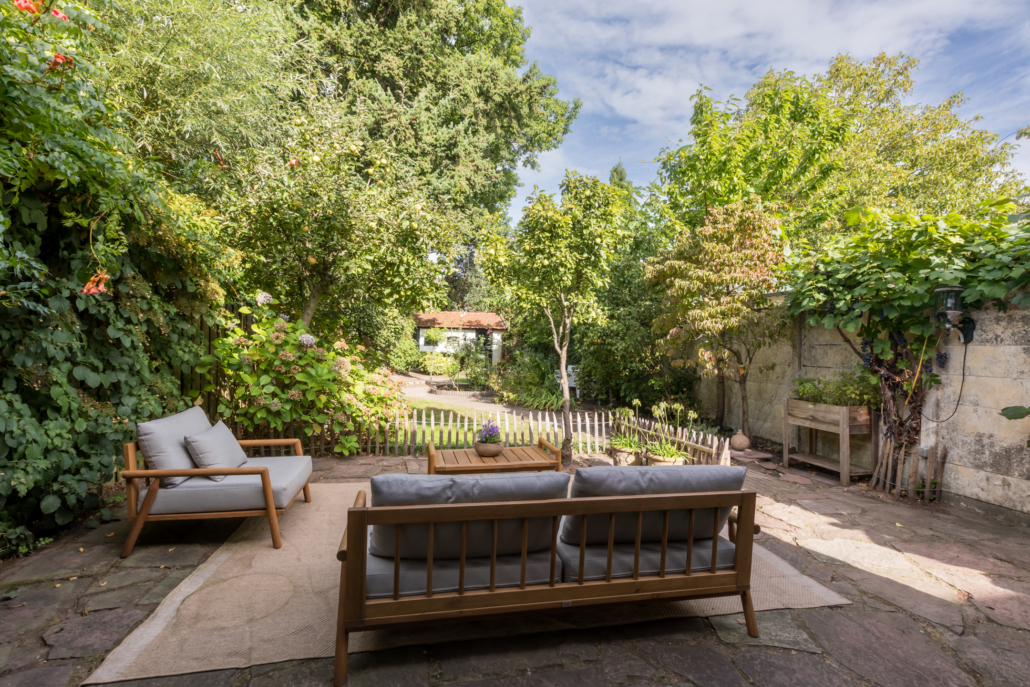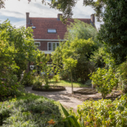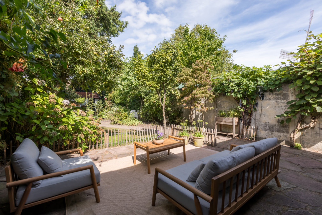 Hier loop je over organisch gevormde paden, langs volwassen beplanting en diverse (fruit)bomen, met kleine terrasjes die uitnodigen om op elk moment van de dag van de tuin te genieten. Het vele groen sluit niet alleen perfect aan bij de stijl van de woning, maar biedt ook verkoeling in de warme zomermaanden.