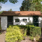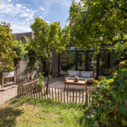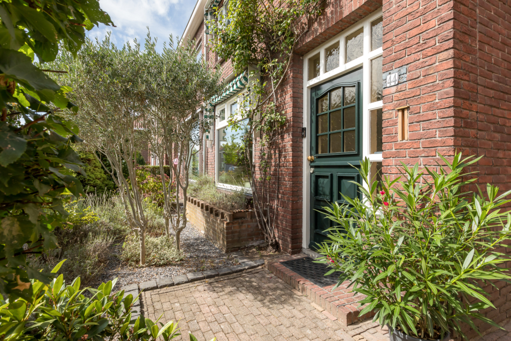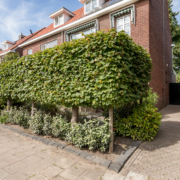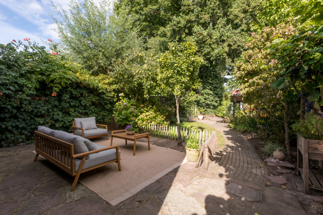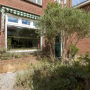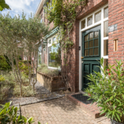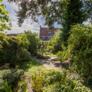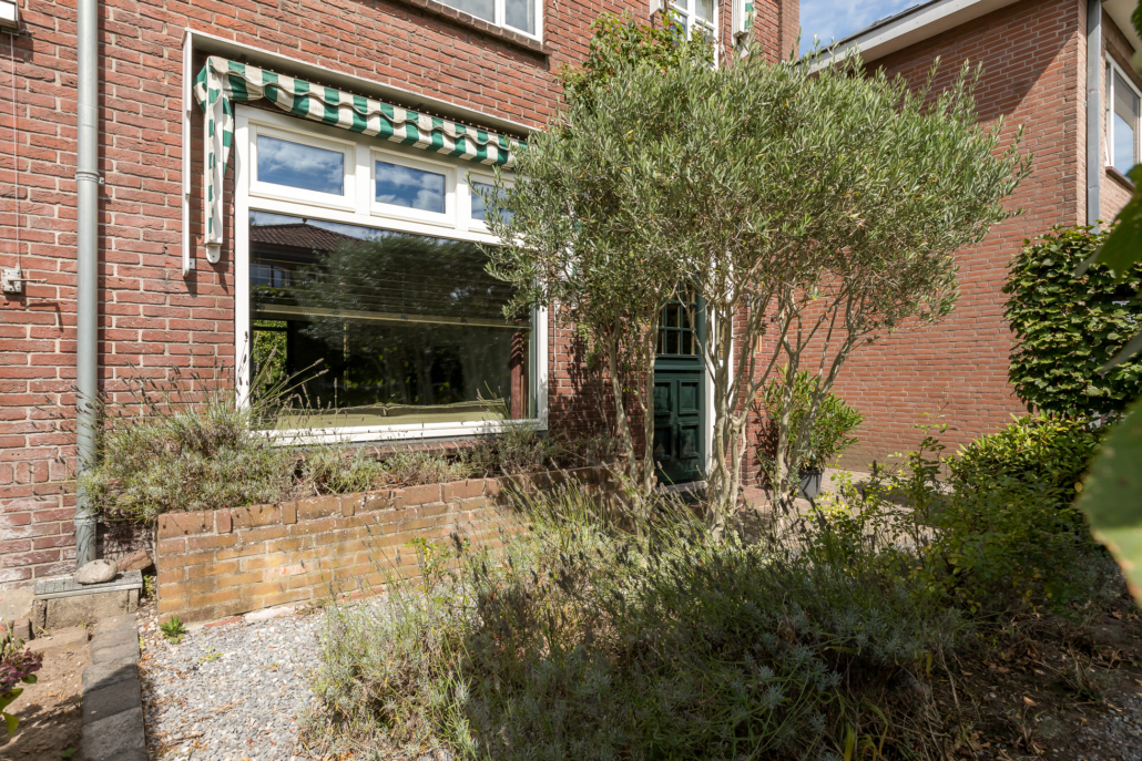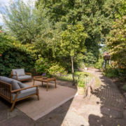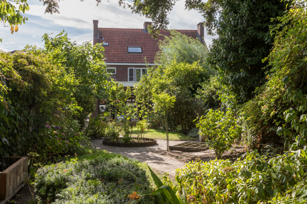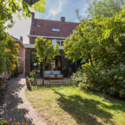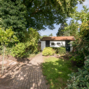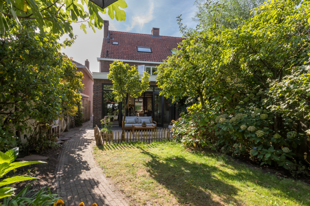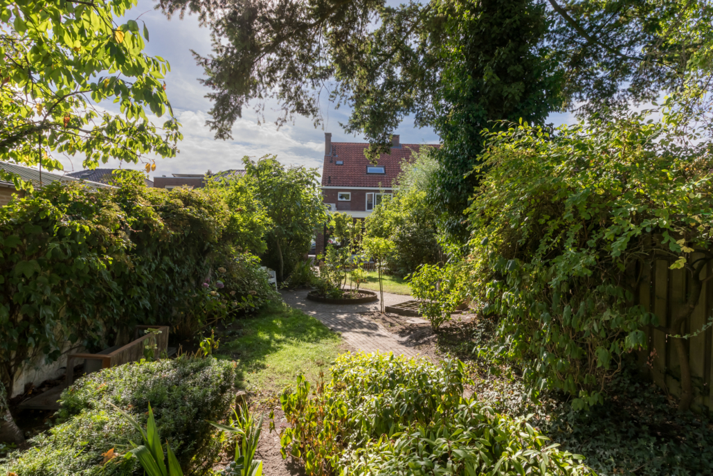 De woning heeft een verzorgd aangelegde voortuin, waar volwassen leibomen zorgen voor optimale privacy. Via het bestraatte pad bereik je de achtertuin, die verrassend diep is en direct een sprookjesachtige indruk maakt.