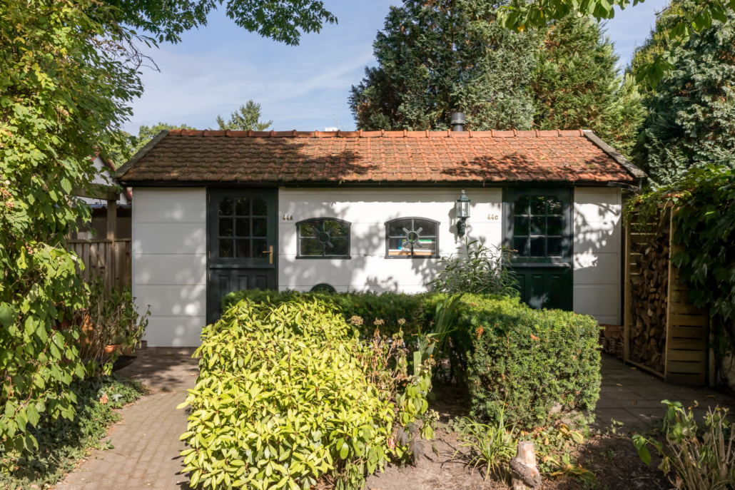 Achter in de tuin staat een multifunctionele ruimte met elektra en water, momenteel ingericht als atelier en opslag, een inspirerende plek met veel mogelijkheden.