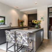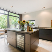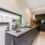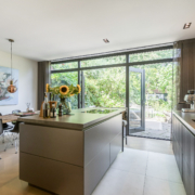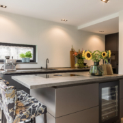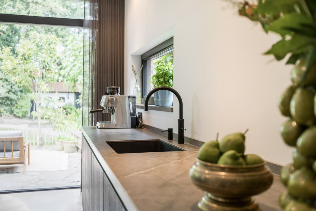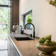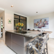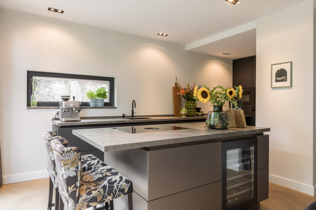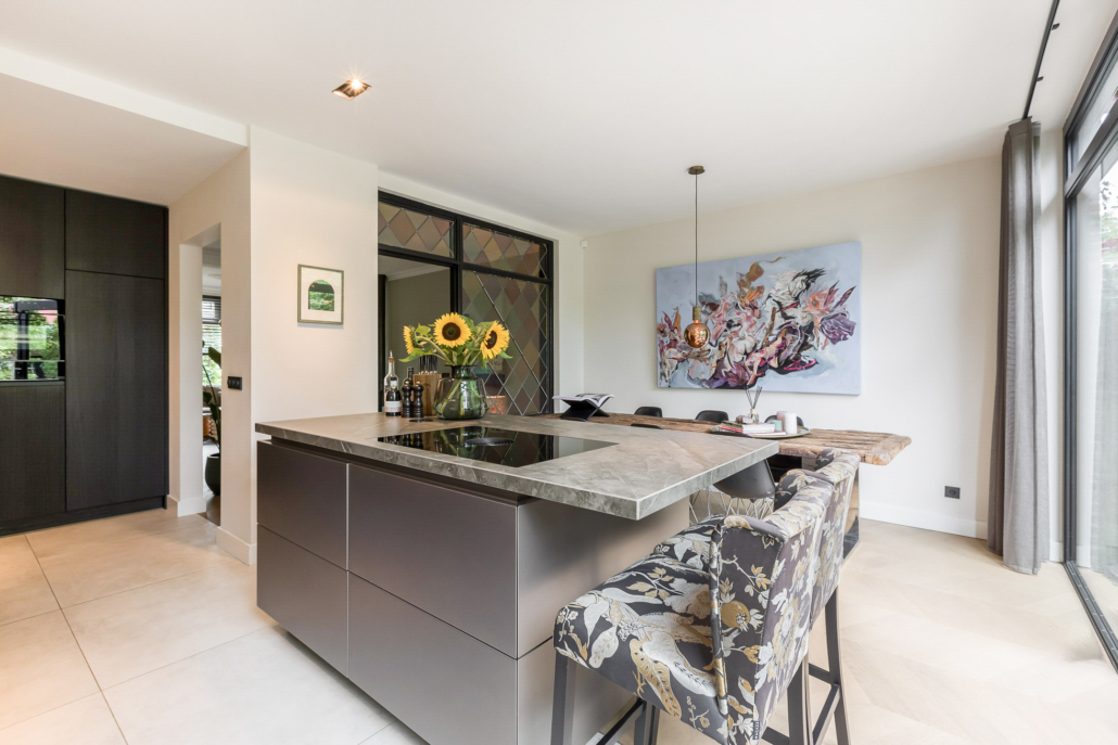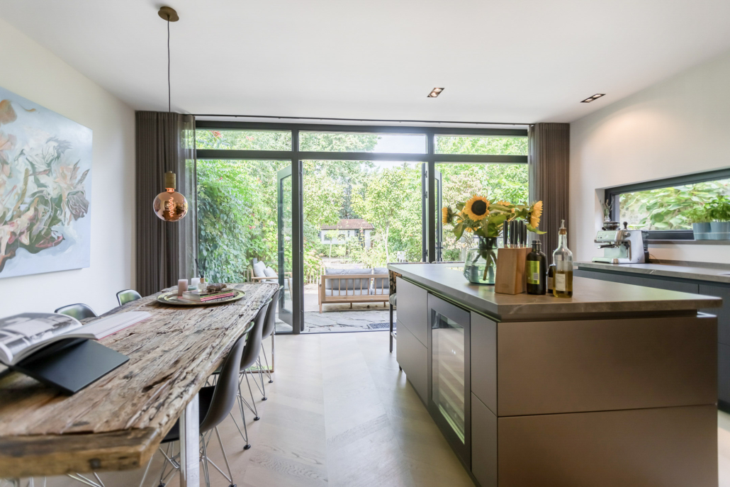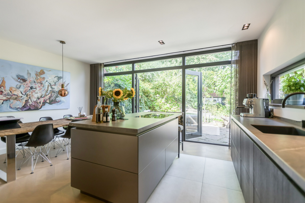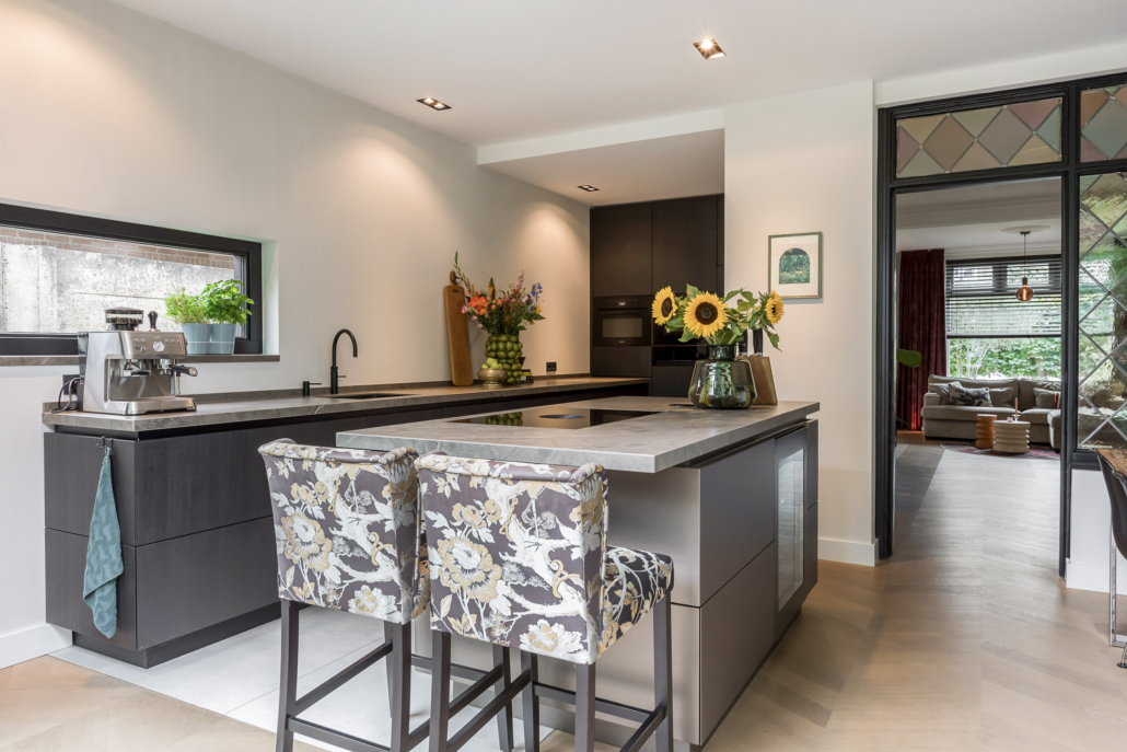 De woning is aan de achterzijde over de volle breedte uitgebouwd. Hierdoor is een luxe woonkeuken ontstaan. De keuken is op maat gemaakt door keukenleverancier/interieurbouwer Paul Dekkers en afgewerkt met luxe materialen. Menig kookliefhebber kan zijn hart hier ophalen. De keuken is voorzien van een Dekton werkblad en diverse Miele inbouwapparatuur zoals stoomoven, combi oven/magnetron, warmhoudlade, koelkast, vriezer, inductiekookplaat met downdraft afzuiging (Bora), quooker en een wijnklimaatkast (Boretti).
