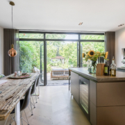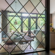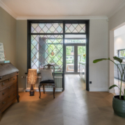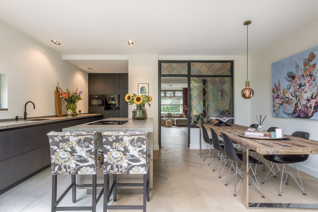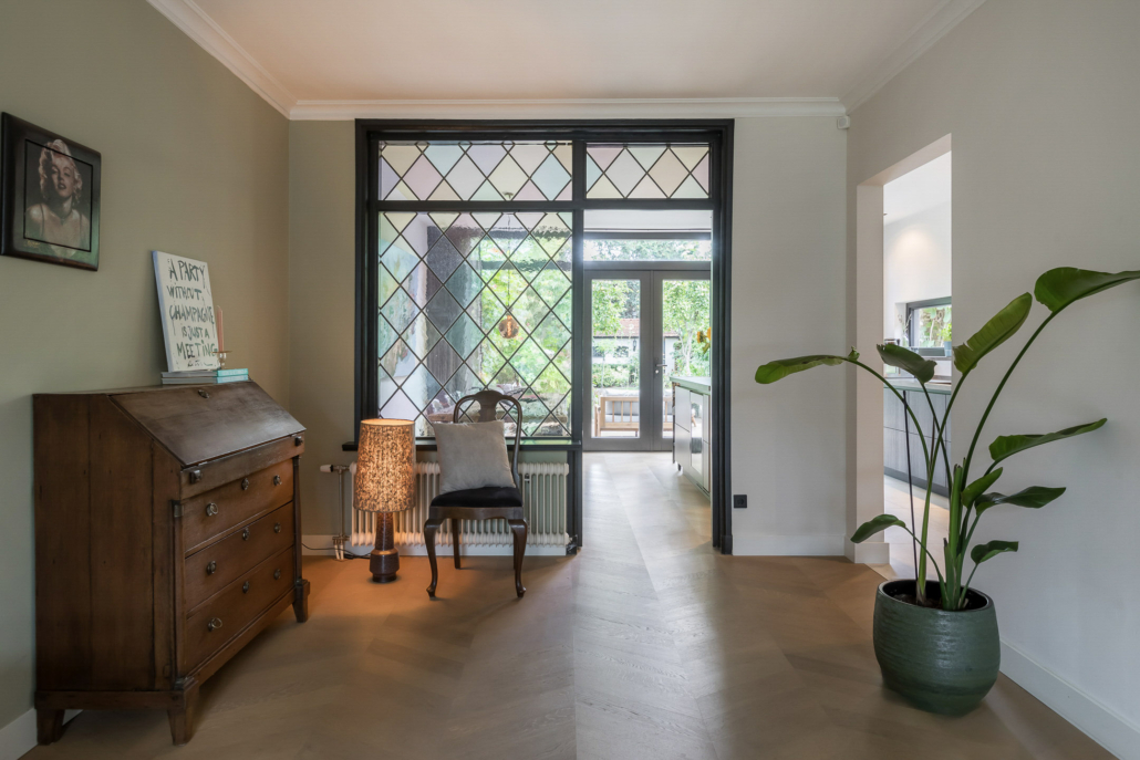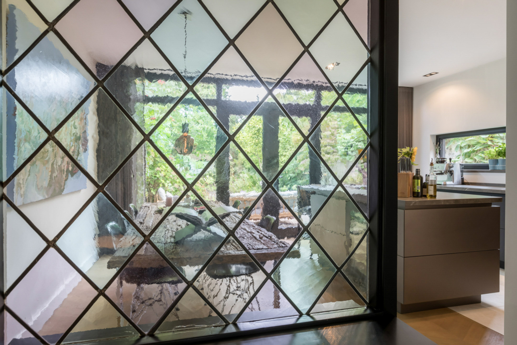 Als authentiek detail is een deel van de originele achterpui bewaard met glas in lood ramen zodat er een creatieve afscheiding ontstaat met de leefkeuken.