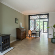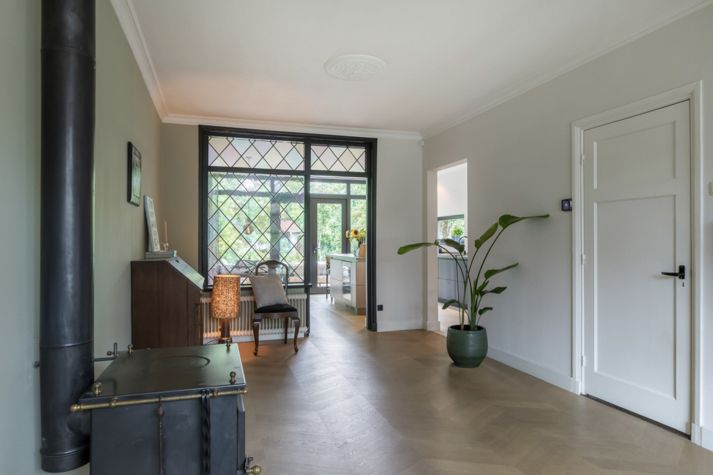 De woonkamer is ruim van opzet en is sfeervol afgewerkt: een prachtig parket gelegd in Hongaarse punt (eiken), nieuw hardhouten kozijn aan de voorzijde met HR+++ geluidswerend glas voor extra comfort en een houtkachel die het geheel compleet maakt.