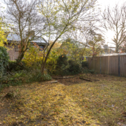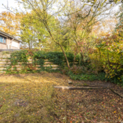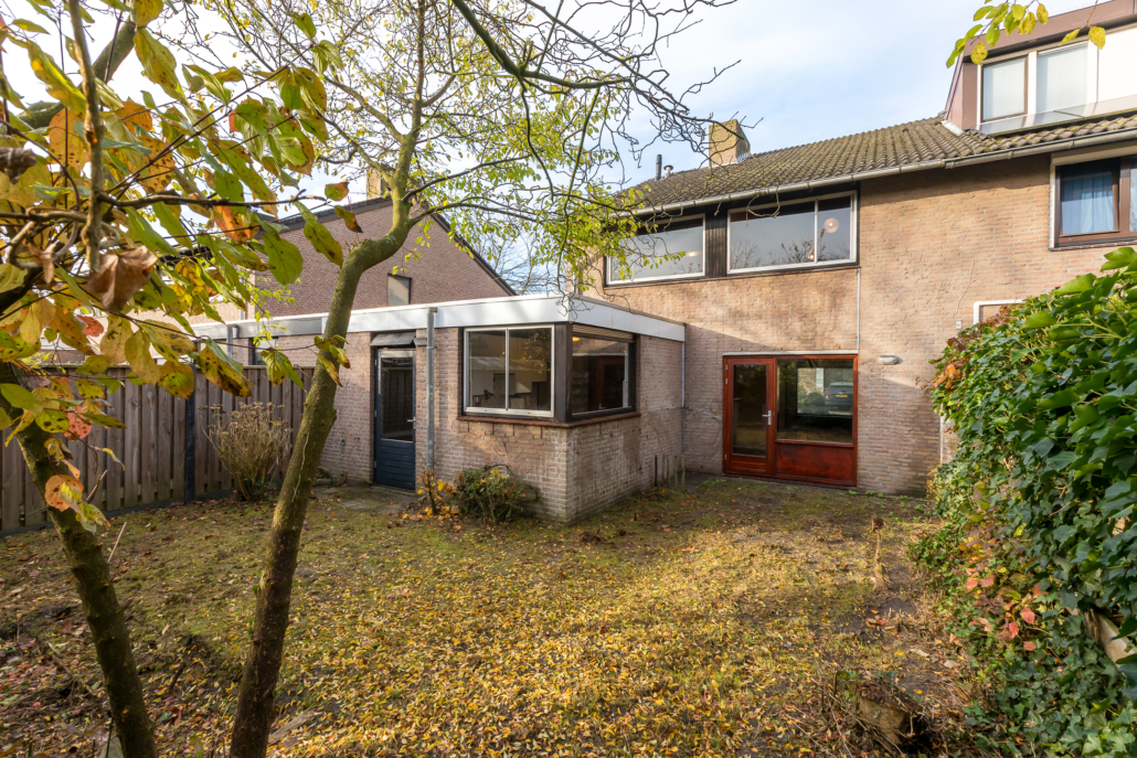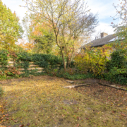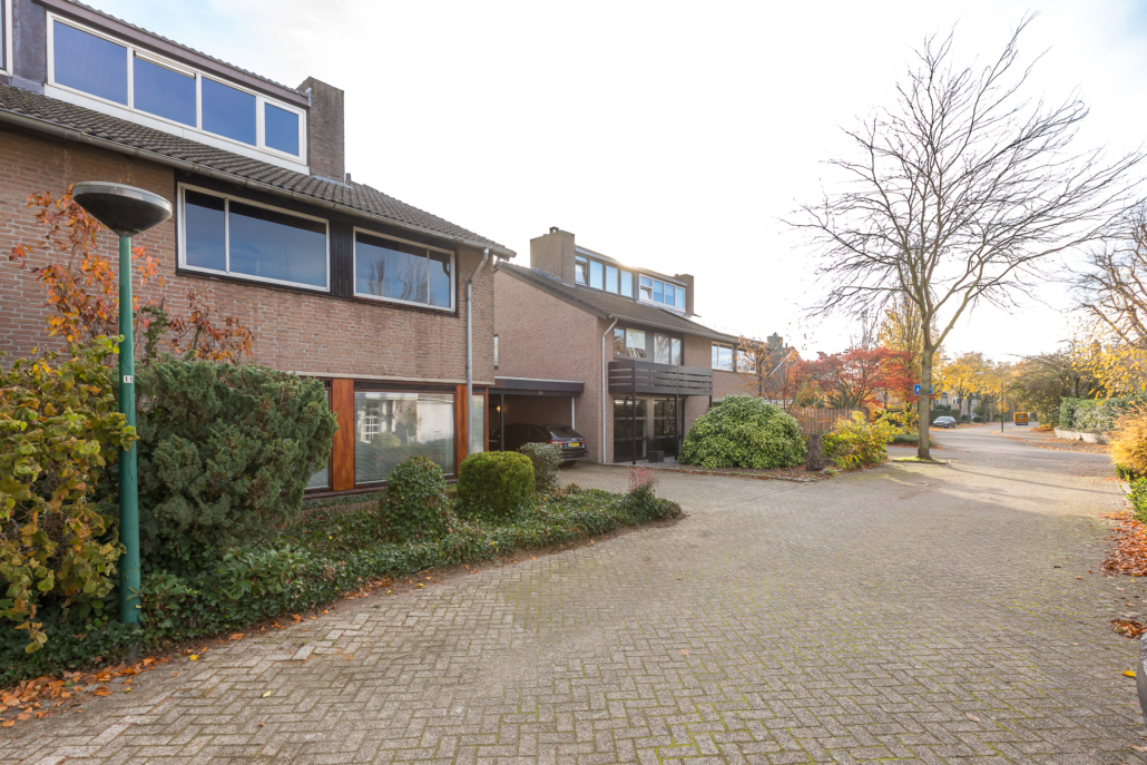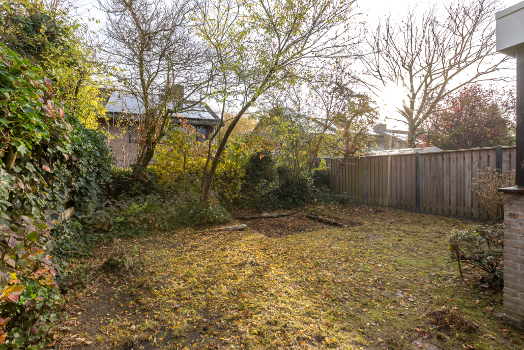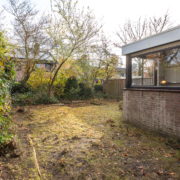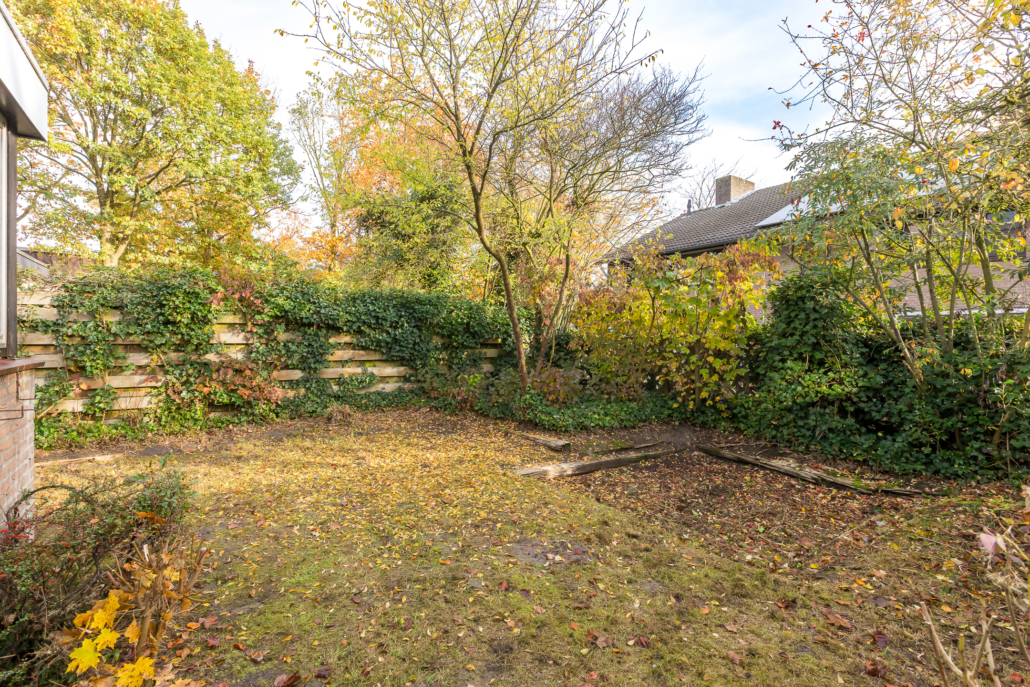 De achtertuin is breed en groen, met volwassen beplanting en een groot gazon – een fijne plek om te ontspannen of te spelen. Aan de voorzijde biedt de bestrate oprit plaats aan meerdere auto’s, deels overdekt.