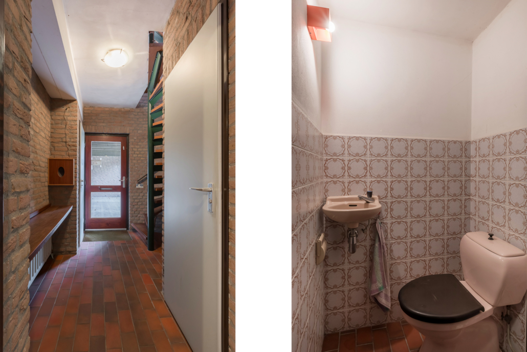 In de hal bevinden zich de meterkast, toiletruimte, trapopgang naar de eerste verdieping en de toegang tot de woonkamer.