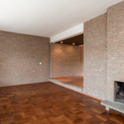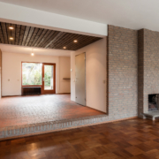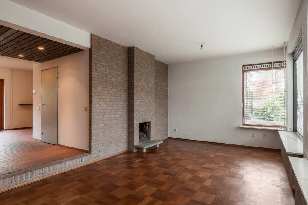 Bij binnenkomst in de woonkamer valt direct het invallende licht en de ruimte op. Het zitgedeelte aan de voorzijde heeft grote ramen aan twee kanten. De open haard vormt het warme middelpunt van de kamer. Doordat dit deel iets verdiept ligt t.o.v. het overige leefgedeelte ontstaat er een knusse, gezellige zithoek.