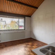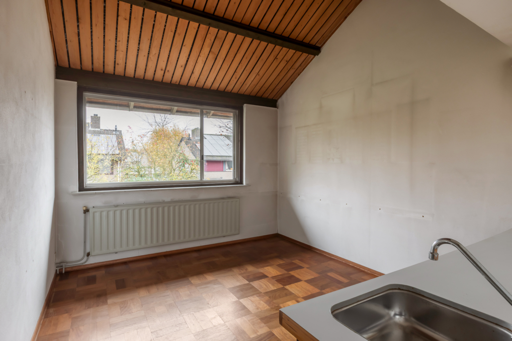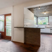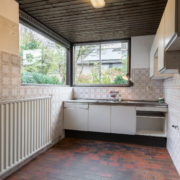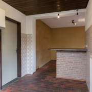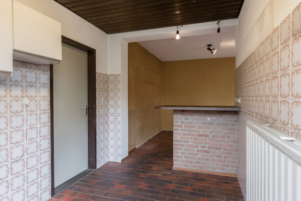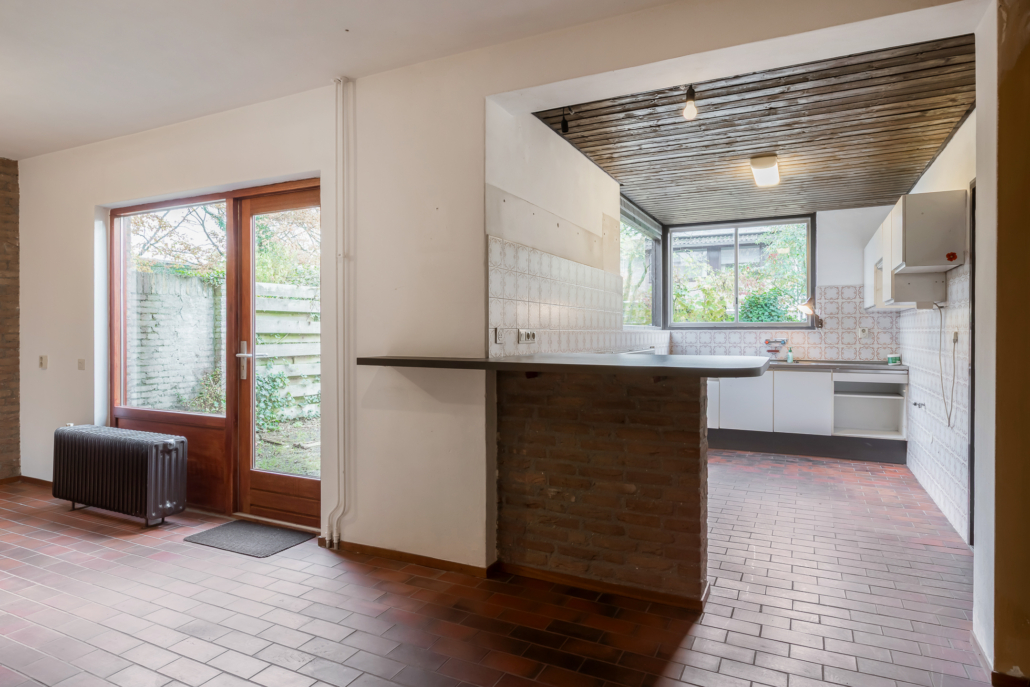 Via de bar is er een verbinding met de woonkamer. De keuken is eenvoudig, maar door de ruimte en lichtinval ideaal om om te toveren tot een moderne leefkeuken.