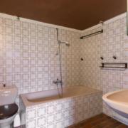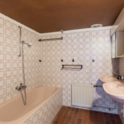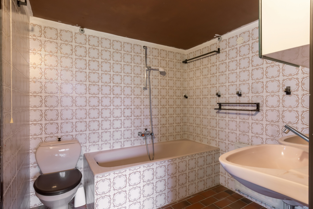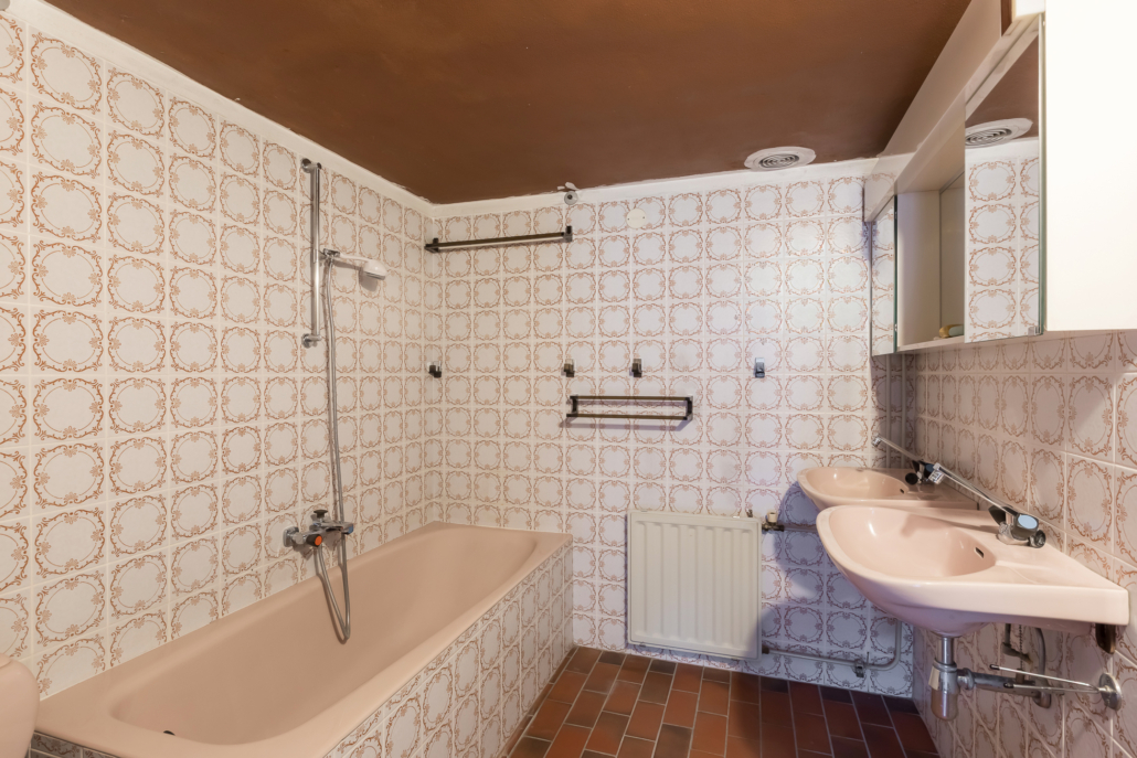 De badkamer is eenvoudig, maar biedt een prettige indeling met ligbad, toilet en dubbele wastafel. Hier kun je met een frisse update een prachtige, eigentijdse badkamer realiseren.