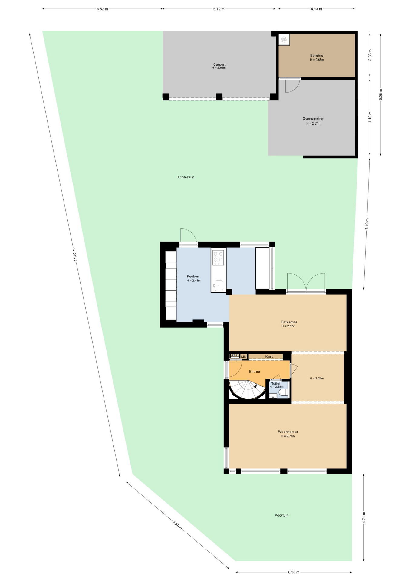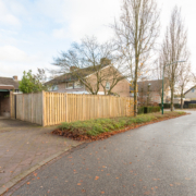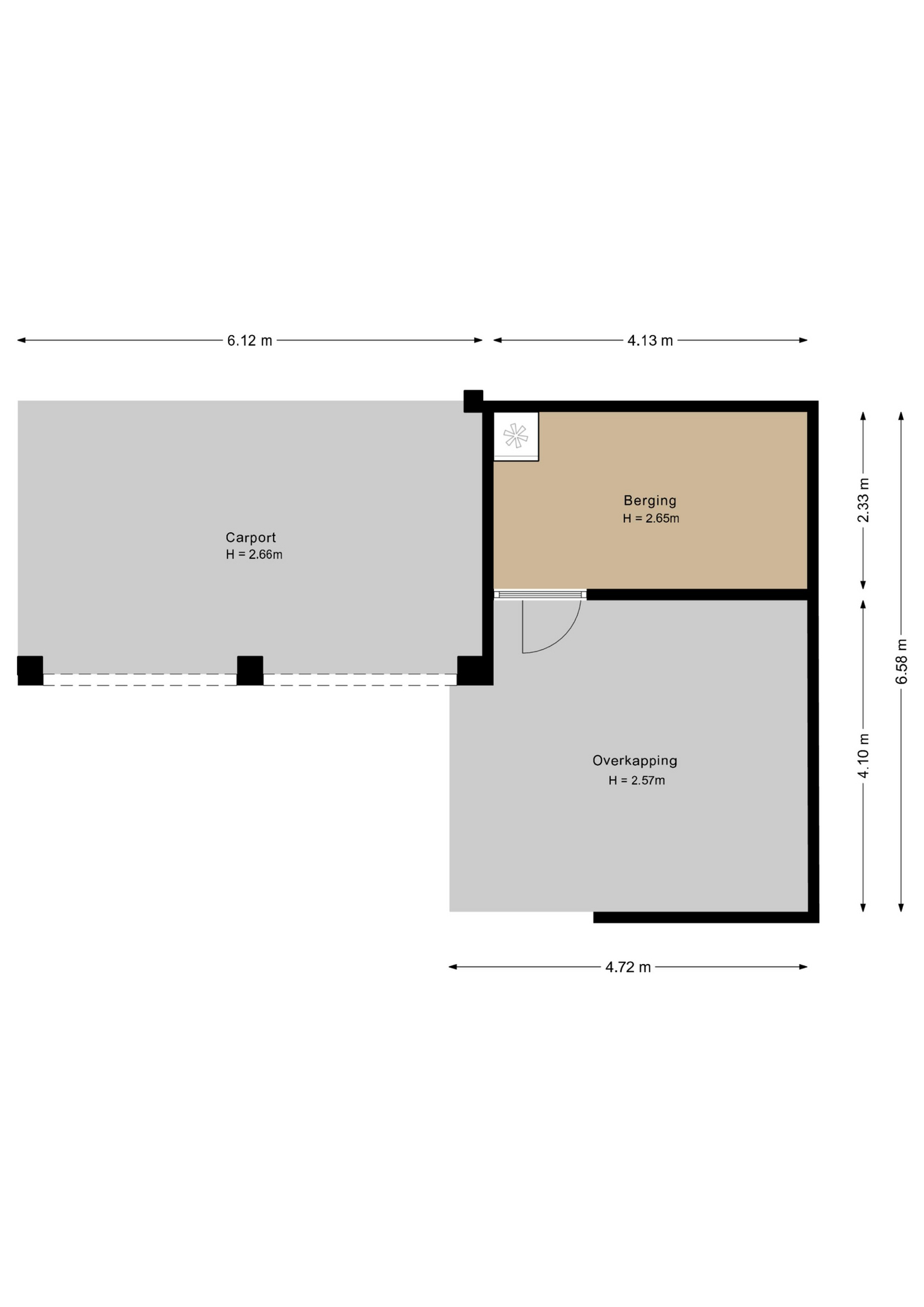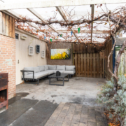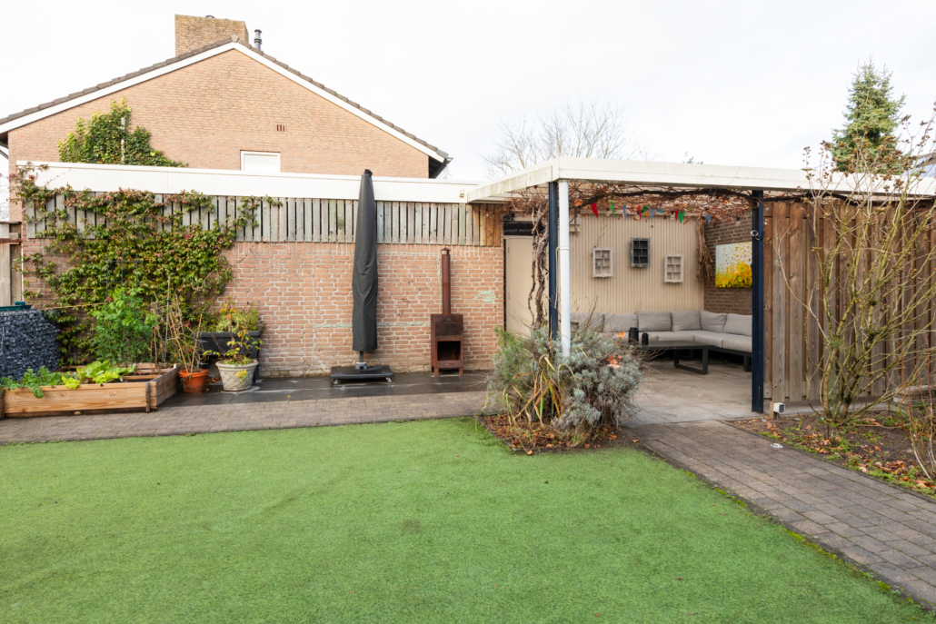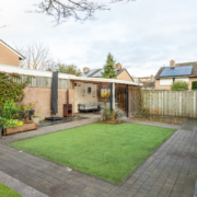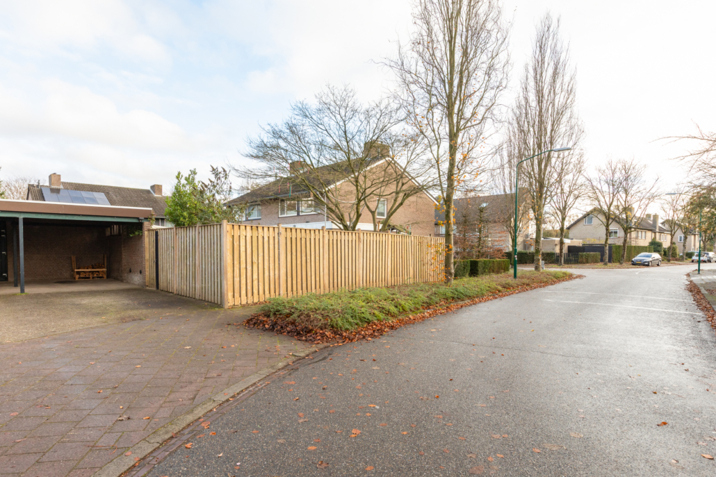 De tuin is afgesloten middels twee looppoorten: één aan de voorzijde bij de voordeur en één vanuit de overdekte carport/oprit aan de achterzijde. De woning heeft aan de achterzijde een oprit en een grote overdekte carport waar je gemakkelijk twee auto’s kunt parkeren.