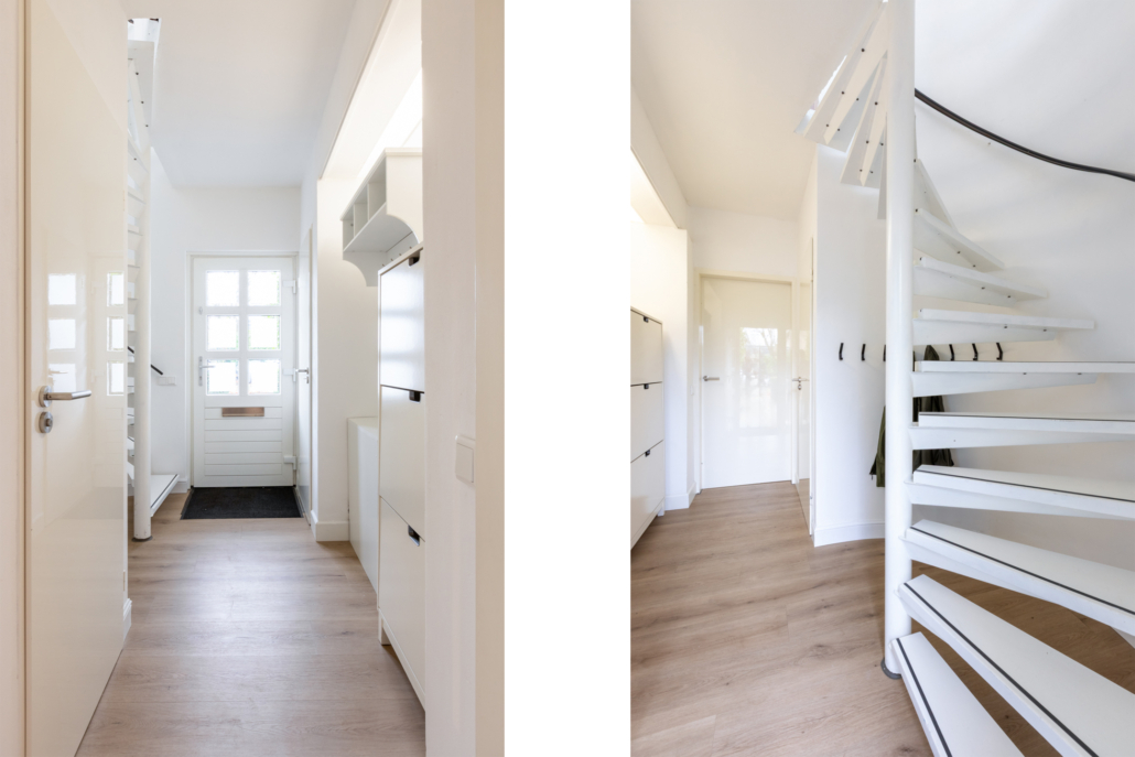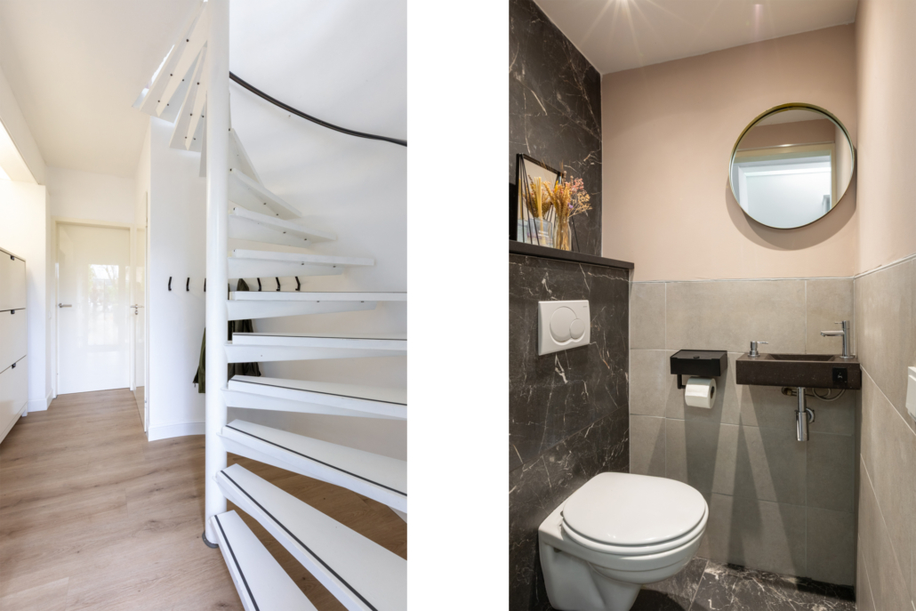 We lopen via de zijkant van de woning naar de overdekte entree en komen binnen in een fijne hal met een vernieuwde toiletruimte, uitgebreide meterkast, trapopgang naar de verdieping en toegang tot de woonkamer.