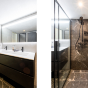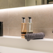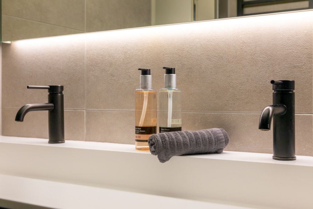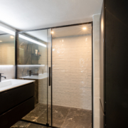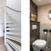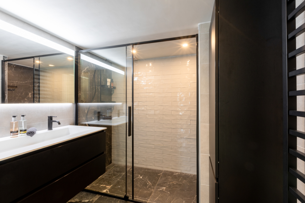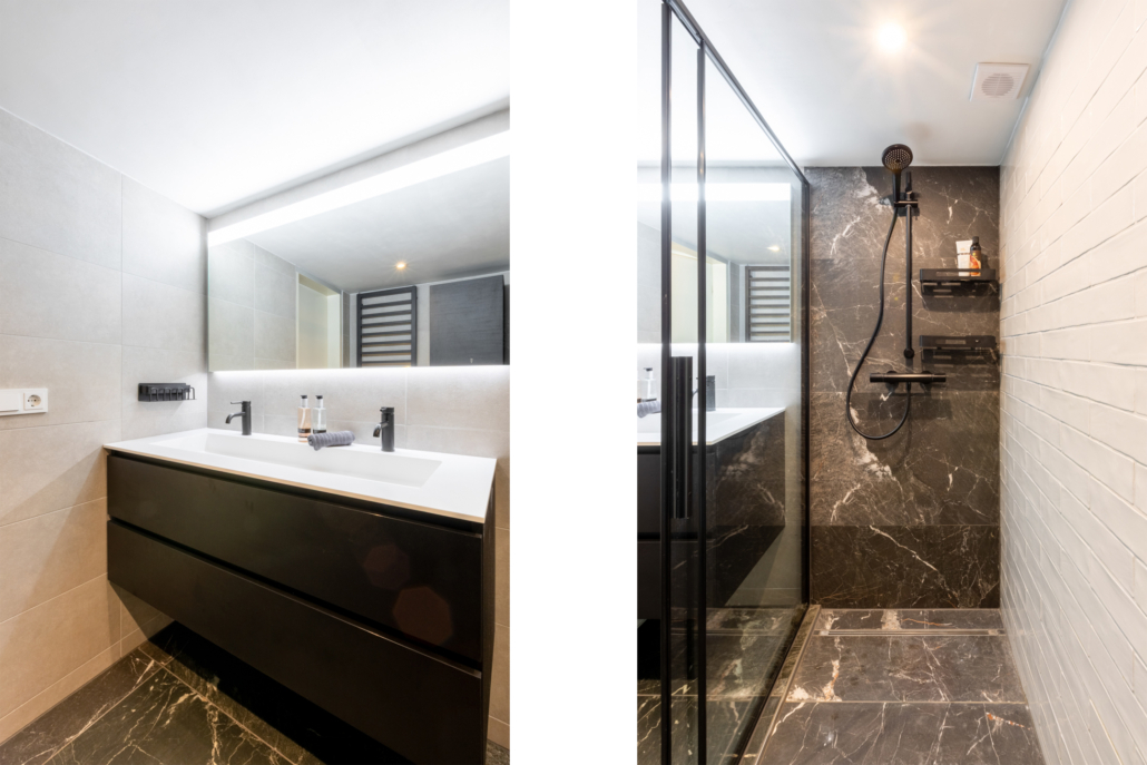 Moderne en ruime badkamer met grote doucheruimte en dubbel wastafelmeubel. Er is een aparte toiletruimte op de verdieping.