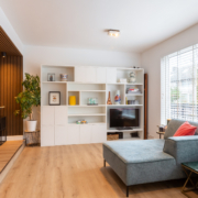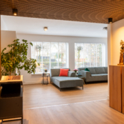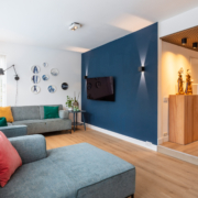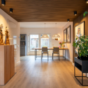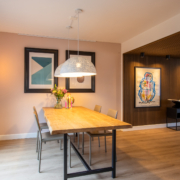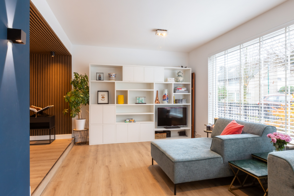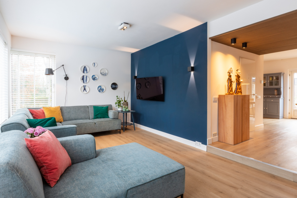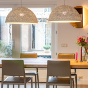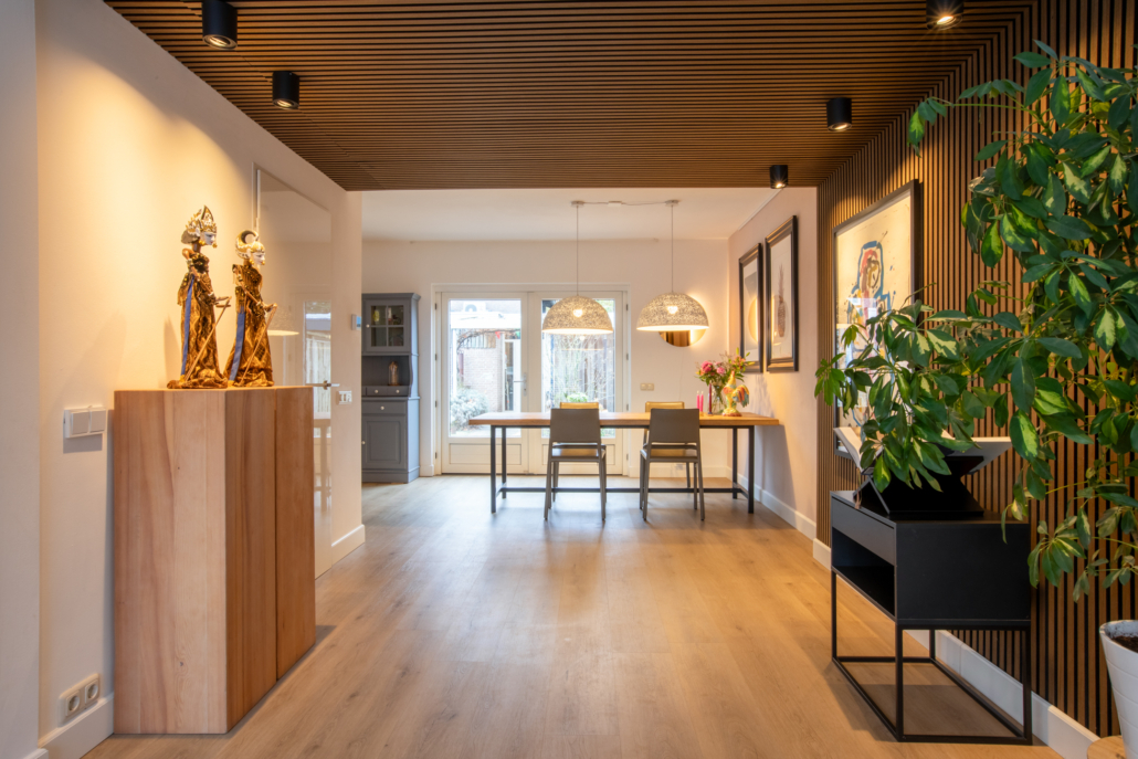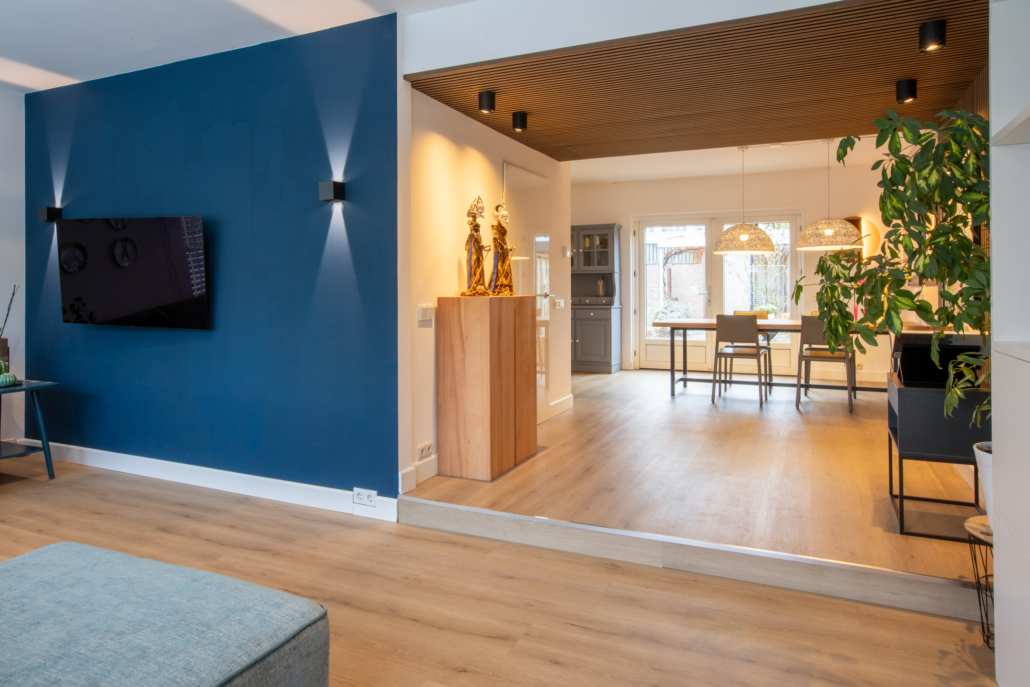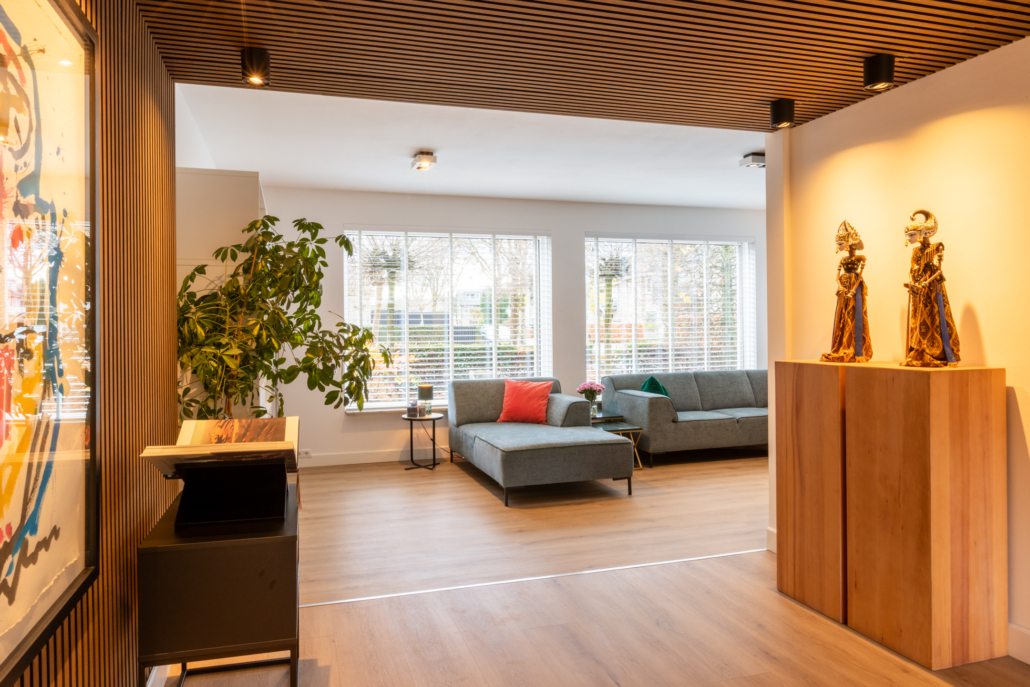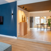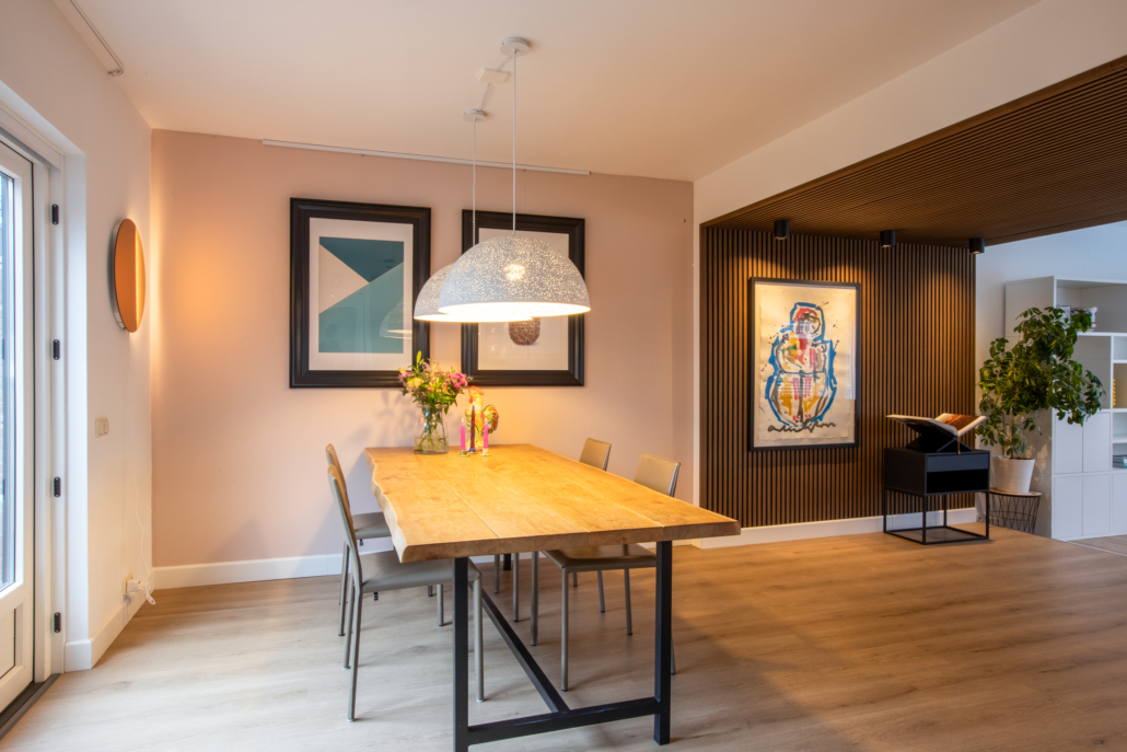 Omdat de woonkamer ruim is, is gekozen voor een zeer doordachte en akoestische afwerking in het midden van de ruimte waardoor er een goed geheel wordt gevormd tussen het zit- en het eetgedeelte van de woning.