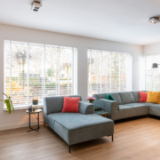 Allereerst maar naar het zitgedeelte aan de voorzijde. Het ligt net iets verdiept waardoor er een speelse verdeling ontstaat waar je heerlijk kunt relaxen/loungen met hele gezin. Het is erg groot en er zijn ramen over de volle breedte én ook nog een zijraam waardoor het een hele lichte ruimte is.