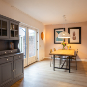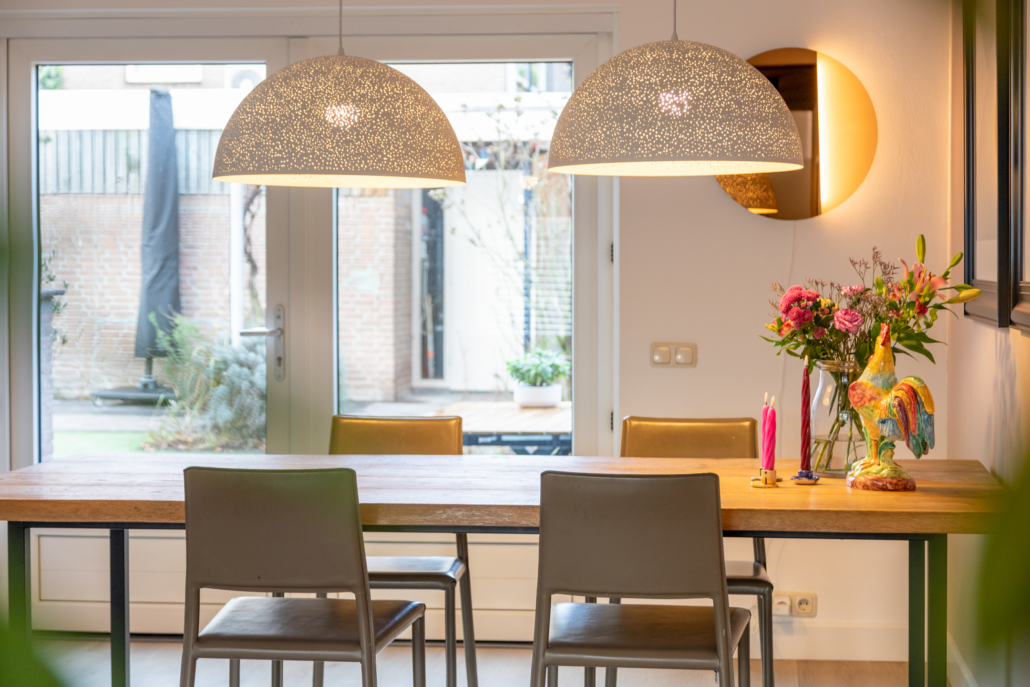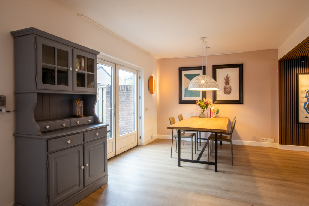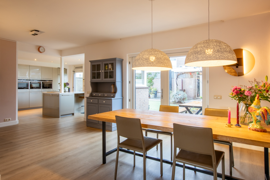 Het eetgedeelte ligt aan de achterzijde en kijkt vrij uit over de groene en grote achtertuin door de grote kunststof pui met openslaande deuren.