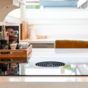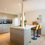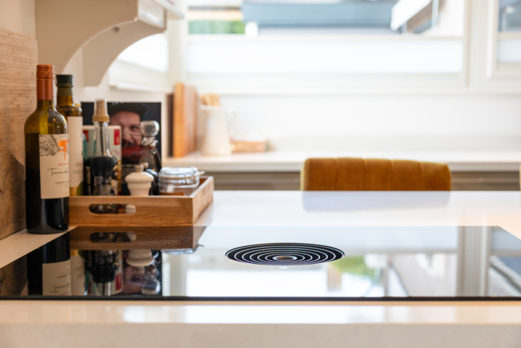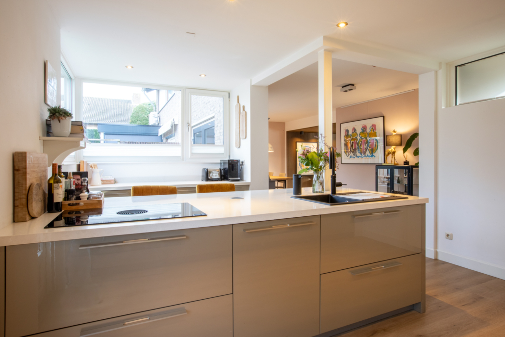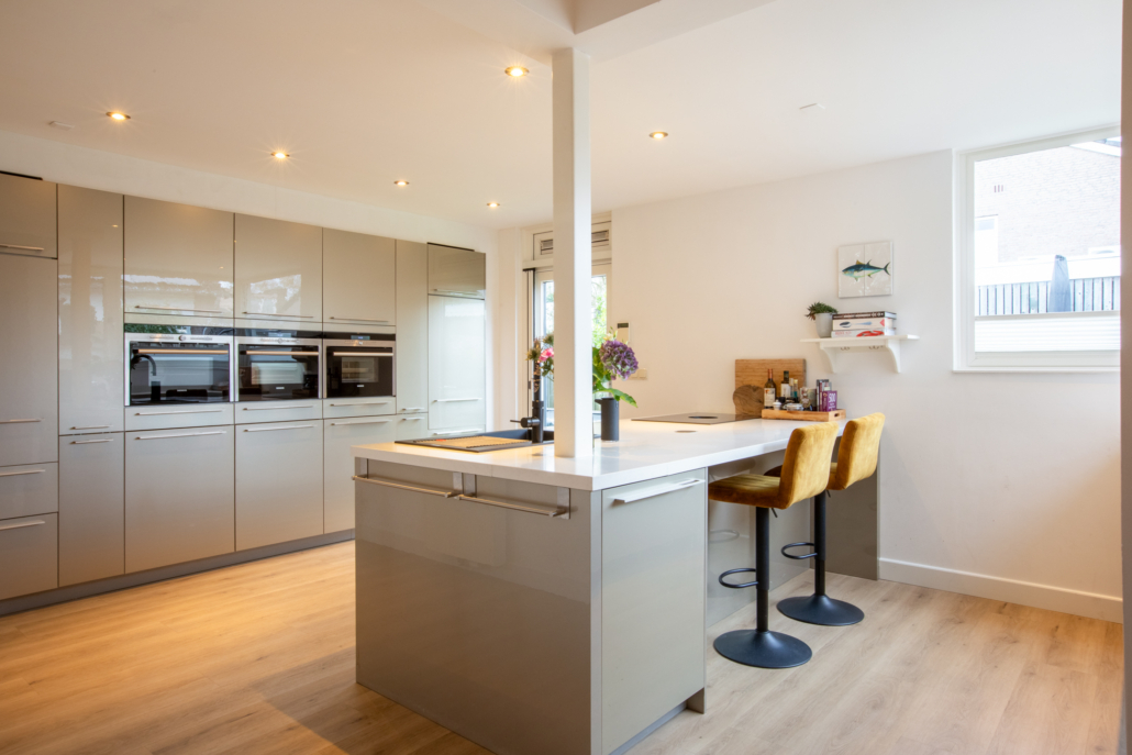 In het midden van de leefkeuken staat het kookeiland met een Bora inductie kookplaat (2023), spoelbak met een Quooker combi (2023), vaatwasser plus nog een gezellig en vooral ook praktisch zitgedeelte verwerkt in het eiland.
