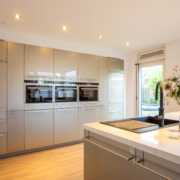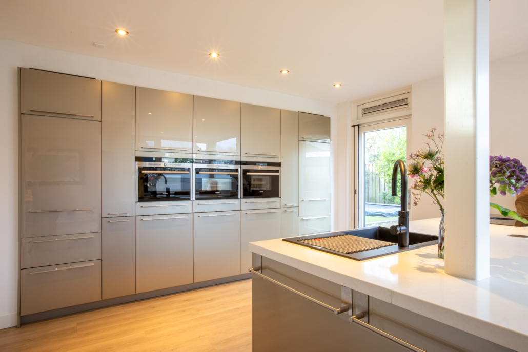 De grote kastenwand aan de andere zijde is volledig ingericht met laden, kasten, apothekerskast, koelkast, vriezer, combi-oven, magnetron en een stoomoven. Er is volop bewegingsruimte waardoor dit werkelijk een droomkeuken is.