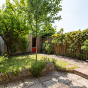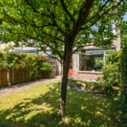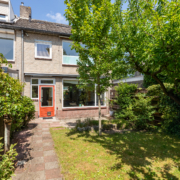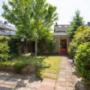 De zonnige achtertuin is een fijne plek voor lange zomeravonden. Met een terras, gazon, volwassen begroeiing én een stenen berging is dit een tuin met veel mogelijkheden. Via de achterom bereik je gemakkelijk de straat.