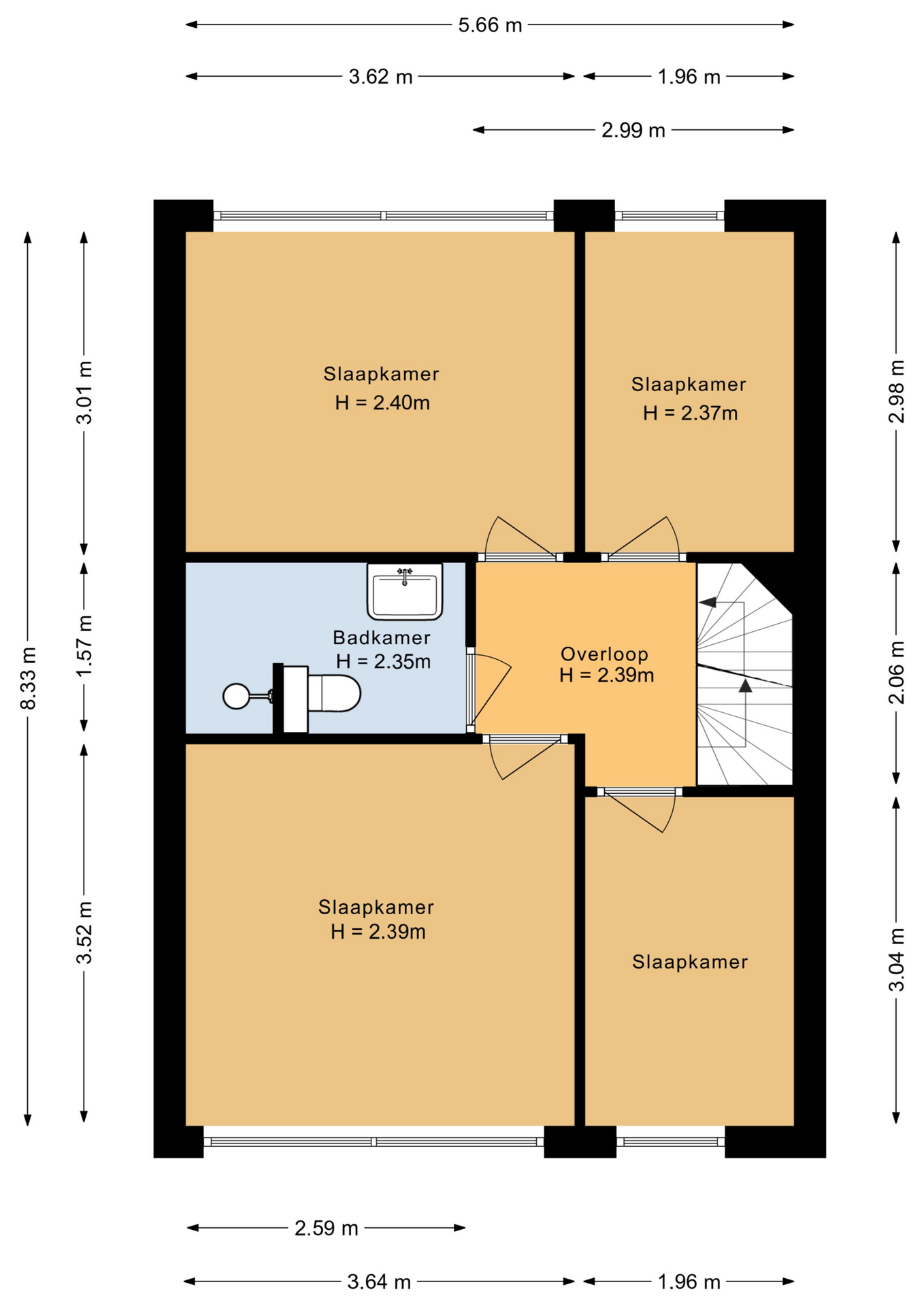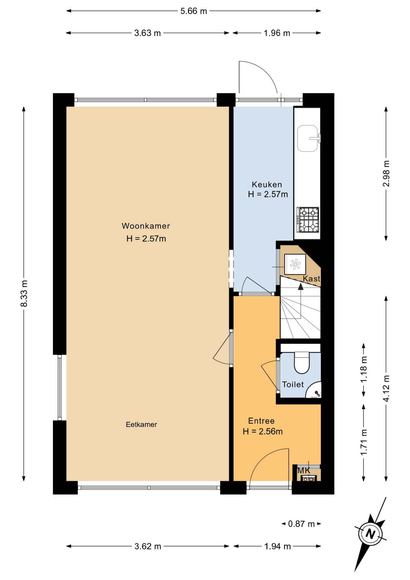 De woning is zorgvuldig professioneel ingemeten. De Meetinstructie is gebaseerd op de NEN2580. De Meetinstructie is bedoeld om een meer eenduidige manier van meten toe te passen voor het geven van een indicatie van de gebruiksoppervlakte. De Meetinstructie sluit verschillen in meetuitkomsten niet volledig uit, door bijvoorbeeld interpretatieverschillen, afrondingen of beperkingen bij het uitvoeren van de meting.