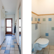 Een pad leidt door de royale voortuin naar de voordeur. Binnenkomend in de hal tref je de meterkast, een nette toiletruimte met hangcloset, de trapopgang en de toegang tot de keuken.