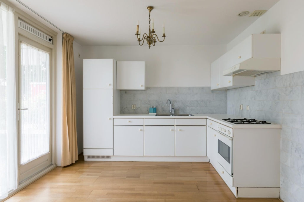 De woonkamer loopt over in de halfopen keuken, met een grote glazen pui en deur naar het terras aan de noordoostkant – een fijne plek voor een kopje koffie in de ochtendzon.