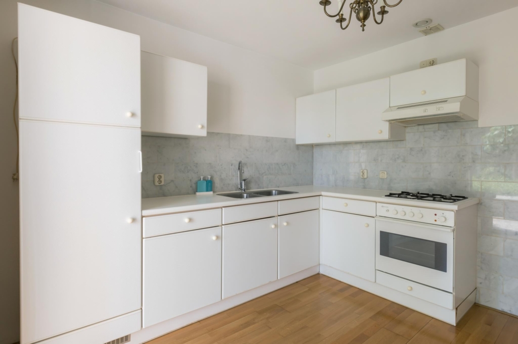 De eenvoudige keuken is praktisch ingericht met een dubbele spoelbak, kookplaat en grote koelkast met vriesvak. Direct ernaast ligt de bijkeuken met aansluitingen voor de wasmachine en de cv-ketel (huur!).